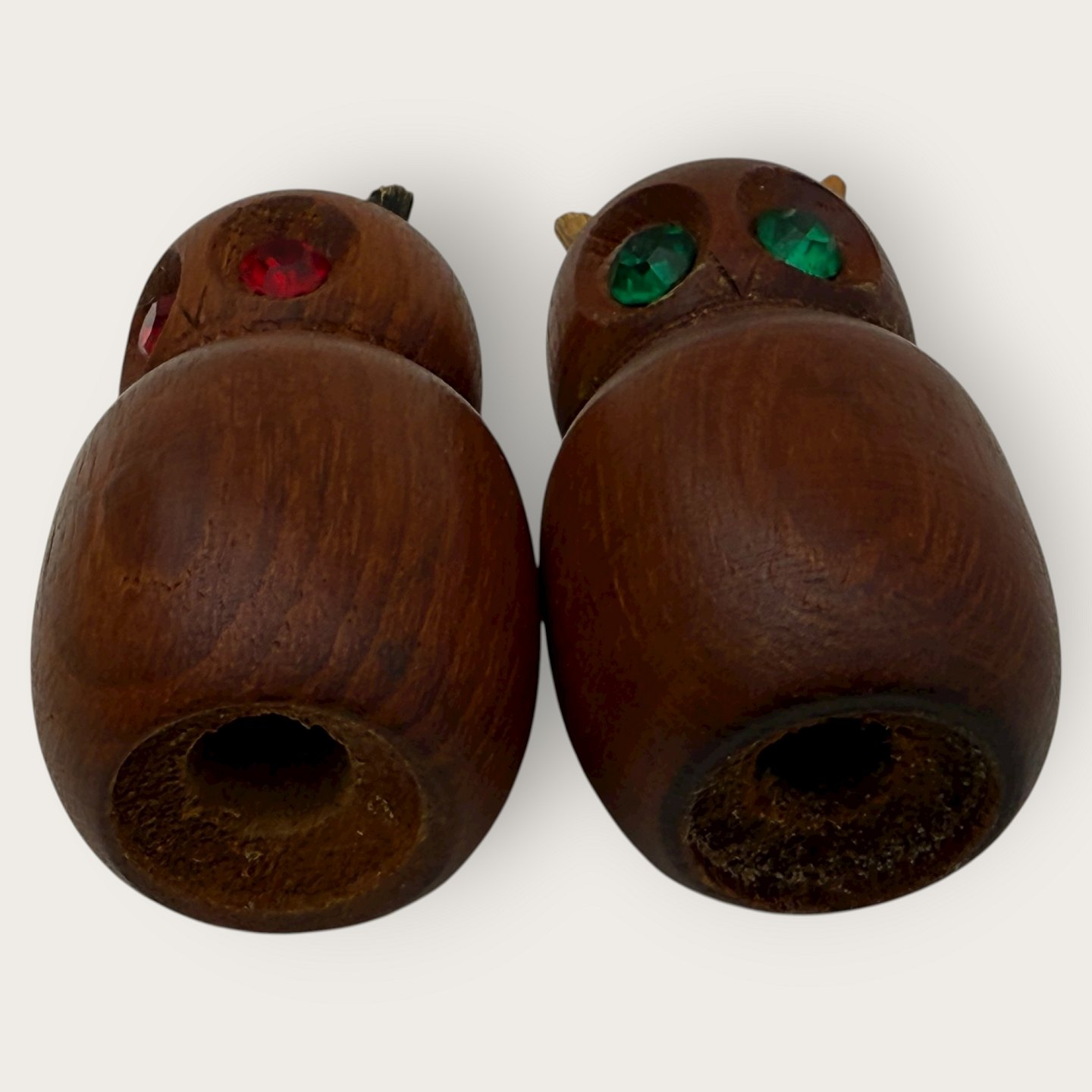 Salt and pepper set in teak wood from the 1960s, birds / owls with green and red eyes, appears nicely patinated and without bottom plugs.Stock: 1