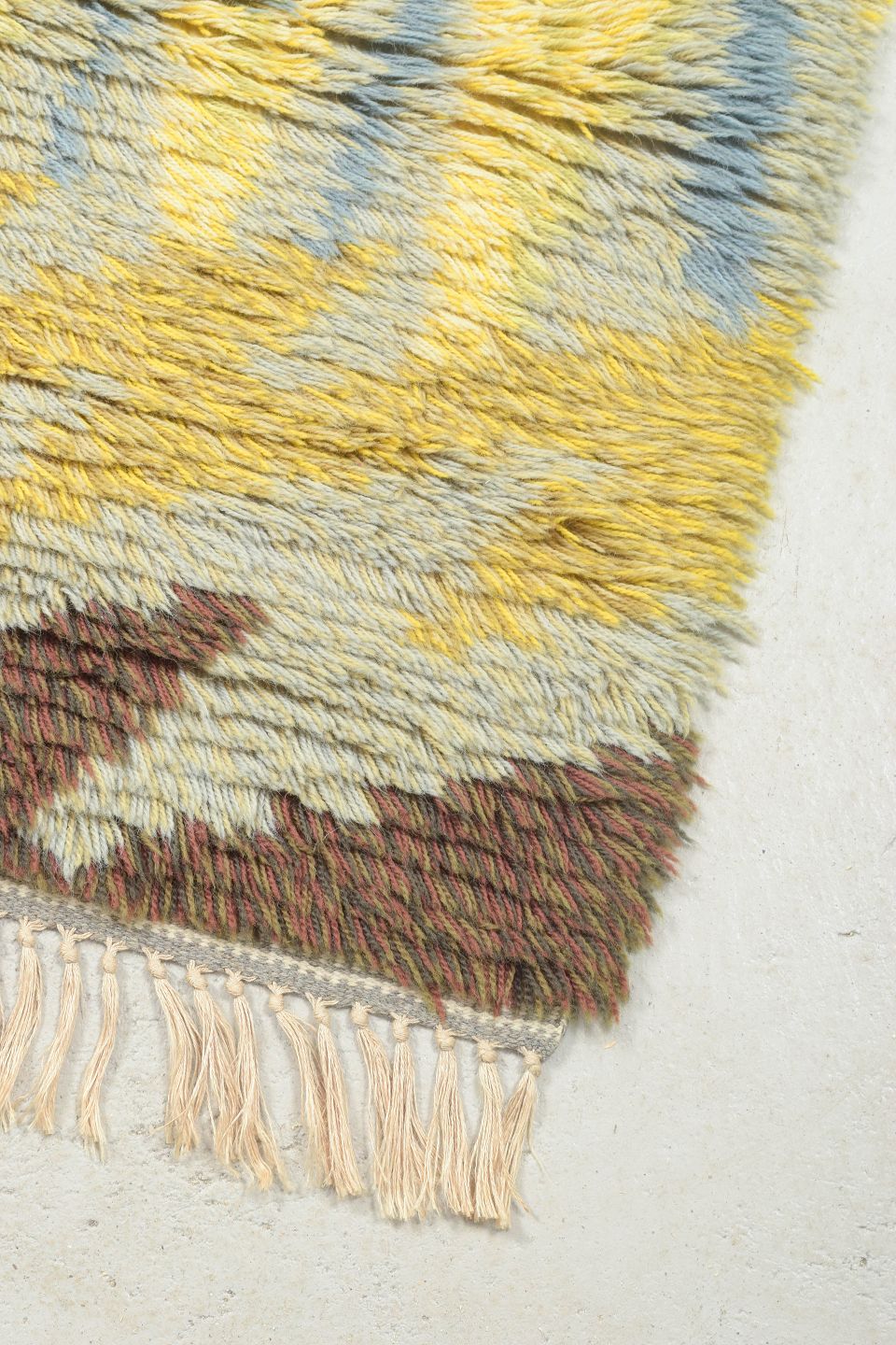 Hand-knotted rya carpet in wool with a zigzag-inspired pattern in shades of yellow, blue, brown, and grey. A distinctive design from the period, using strong contrasts and geometric forms to create vibrancy and movement within the Scandinavian textile tradition.