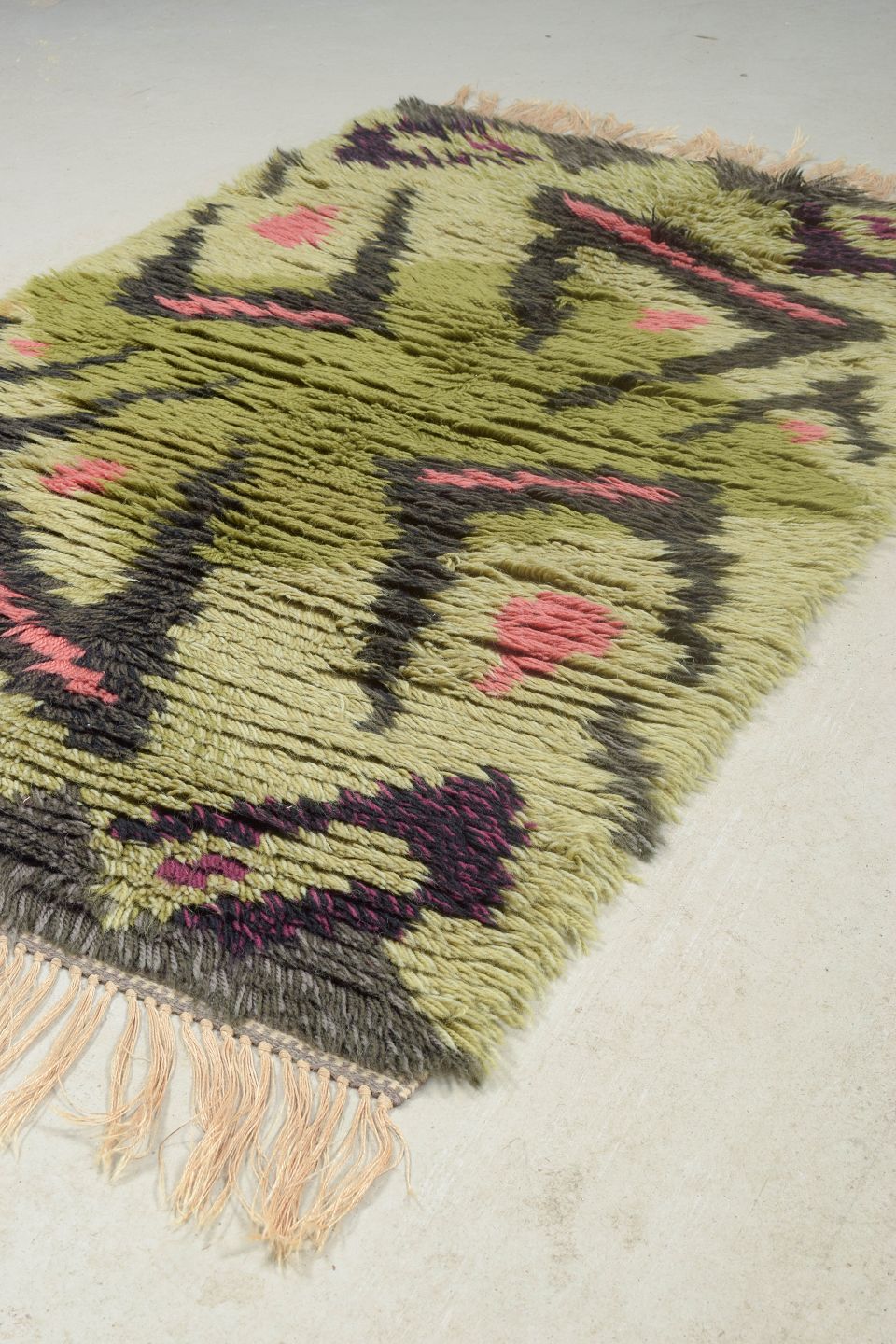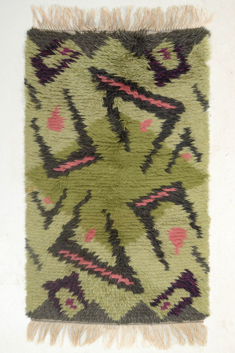 Hand-knotted rya carpet in wool with a graphic pattern in olive green, pink, black, and deep purple. A lively and distinctive design from the period, where bold colours and abstract shapes were used to create dynamic and artistic textiles.