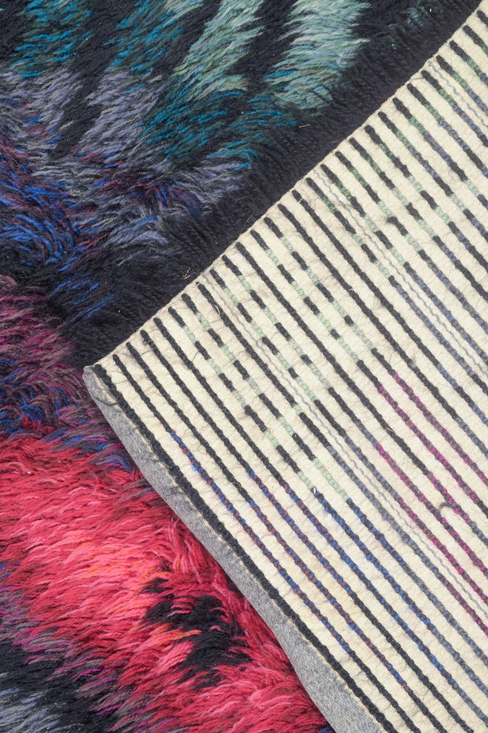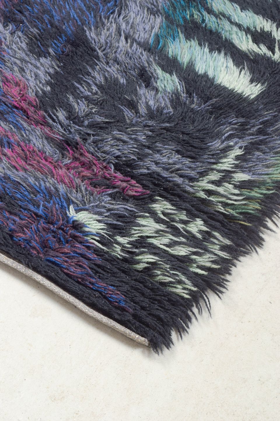 Hand-knotted rya carpet in pure wool designed by Ingrid Starling. An expressive and vibrant piece with an abstract composition in deep blue, turquoise, green, and pink tones. The carpet reflects the artistic freedom and colour experimentation characteristic of Swedish textile art during the period.