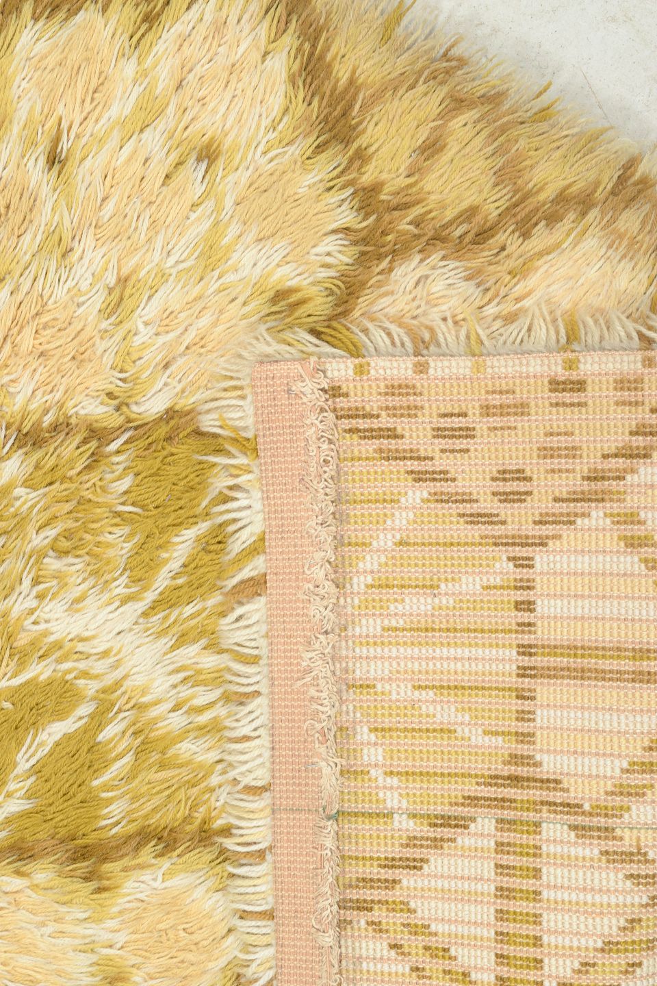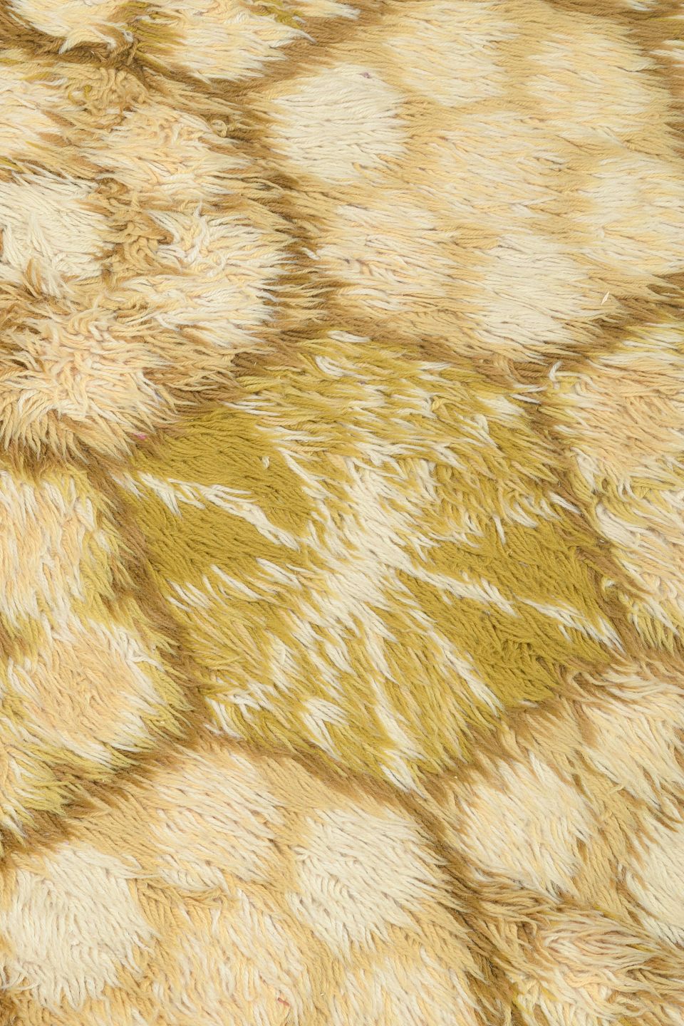 Hand-knotted rya carpet in wool designed by Marianne Richter, featuring a geometric pattern in golden, beige, and olive tones. A refined example of Swedish textile art, blending modernist forms with warm, natural colours.