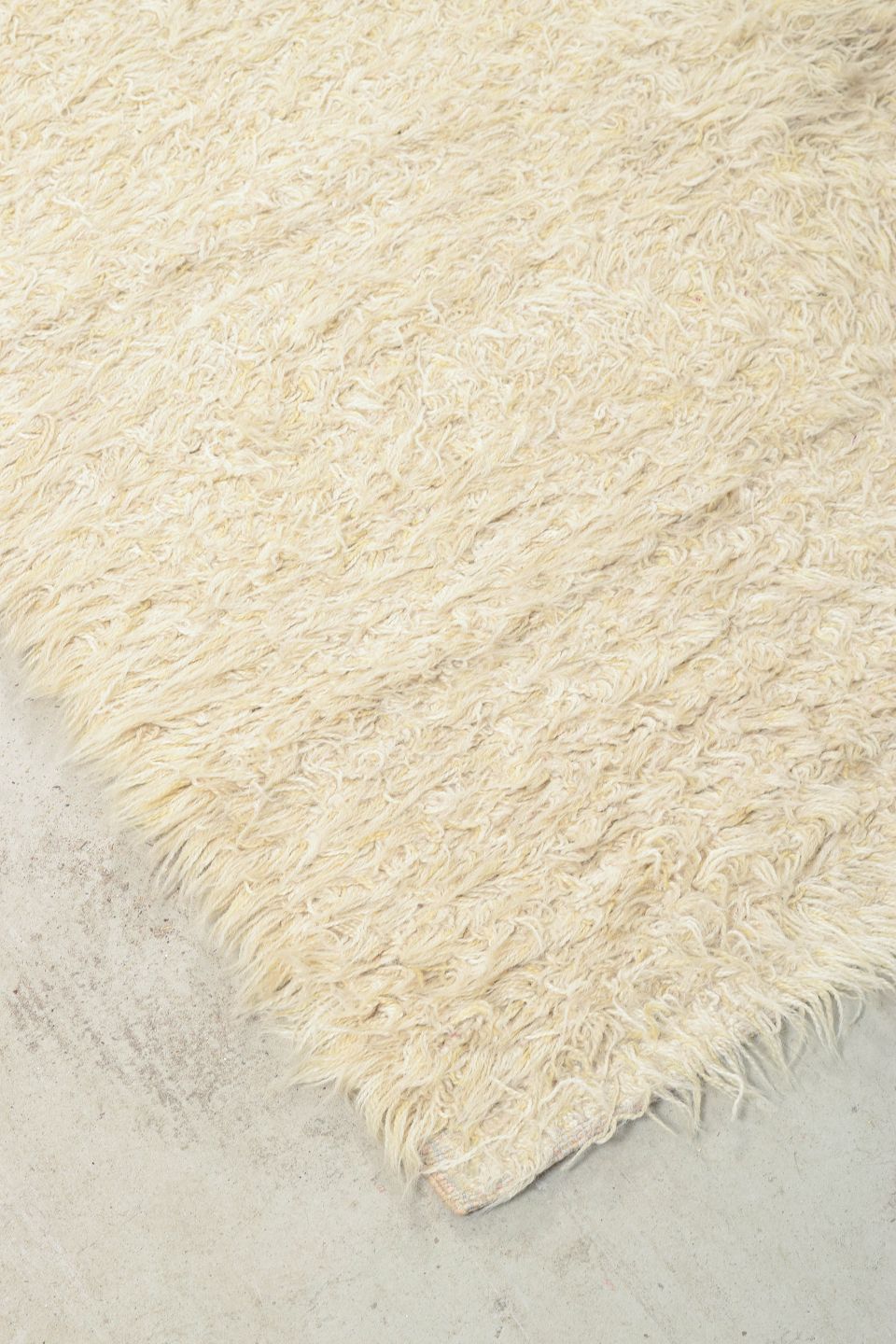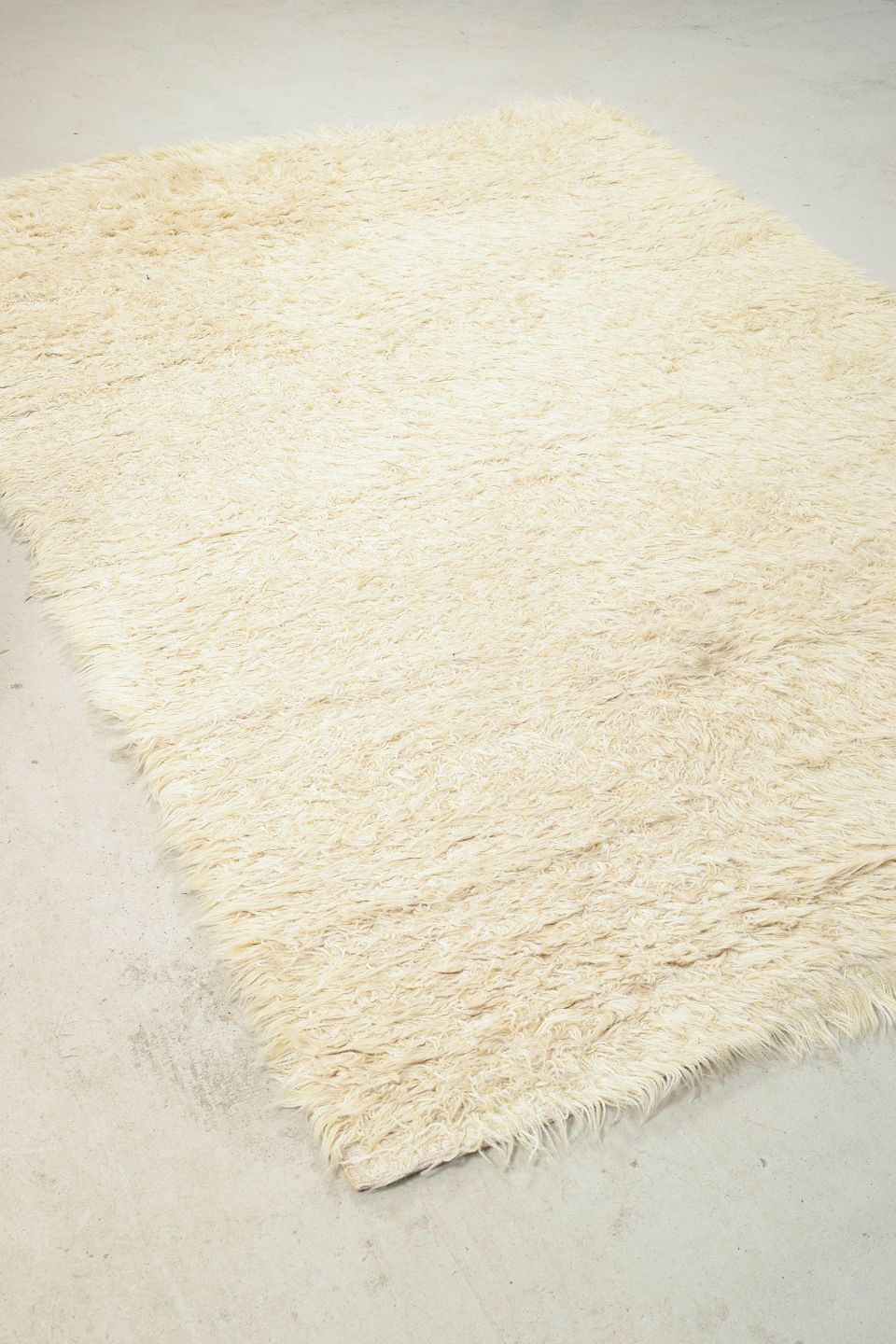 Hand-knotted rya carpet in natural white wool, produced by Blekinge Rya. A typical Scandinavian design from the period with a dense pile and minimalist expression, highlighting the warmth and tactile beauty of the material. The piece reflects the simple elegance and fine craftsmanship characteristic of Swedish textile design of the era.