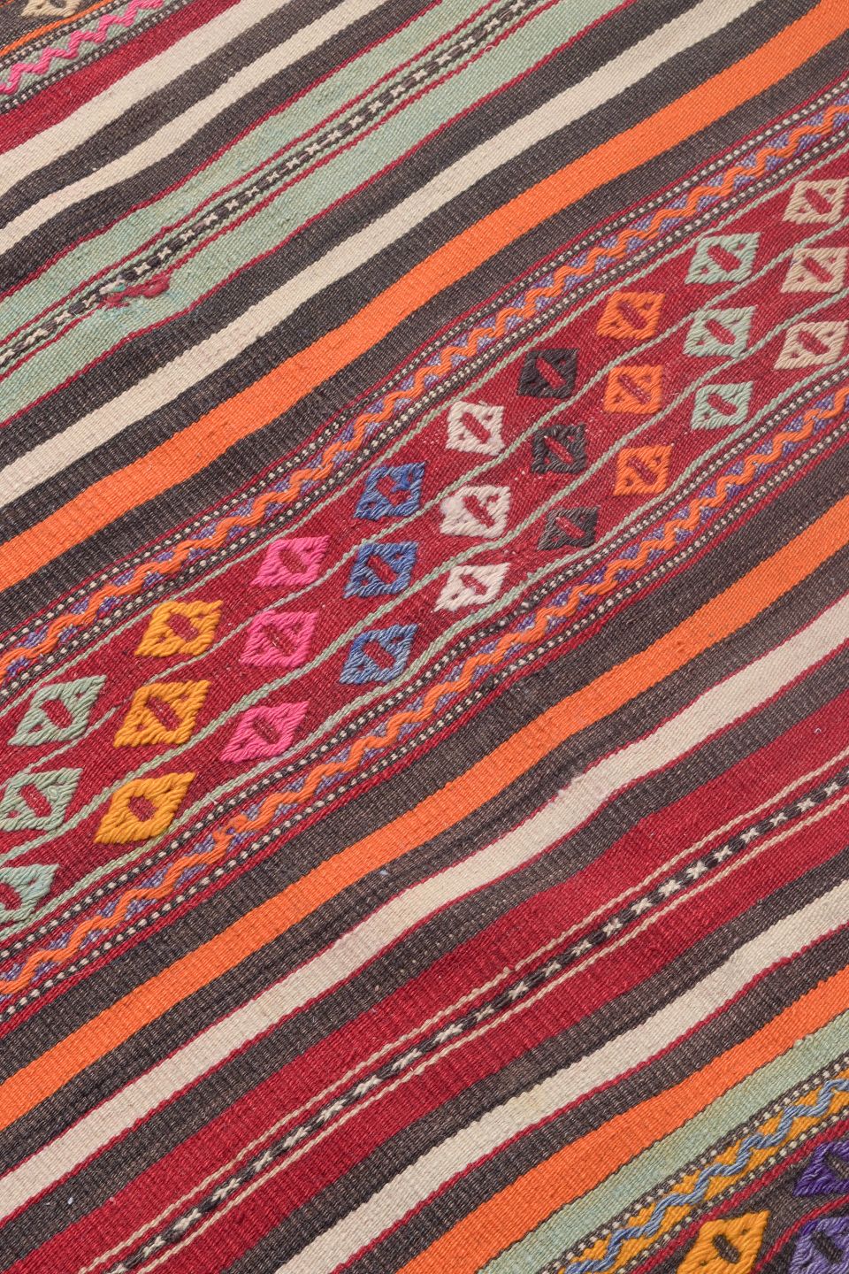 Kelim weaving has ancient origins and was traditionally used for floor, wall and furniture coverings. During the 1960s and 70s, colourful kelim carpets experienced a revival as decorative interior pieces suited to the bohemian and nature-inspired aesthetics of the era.