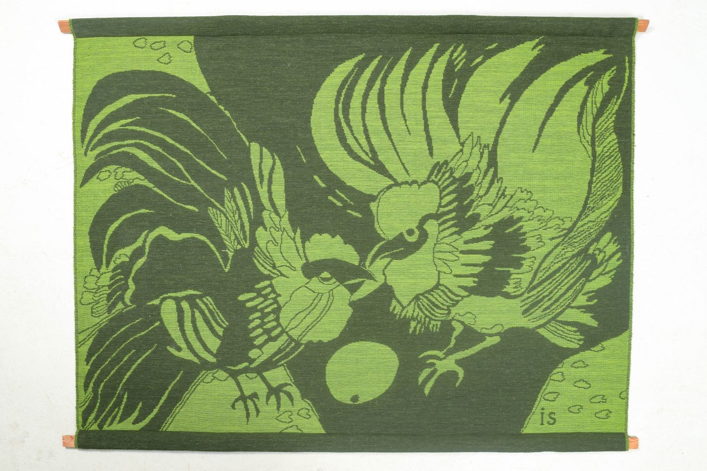 Hand-woven Swedish wall tapestry in pure cotton depicting two roosters in motion in shades of green. Signed “IS” in the weave. A decorative and characteristic work by textile artist Ingegerd Silow.