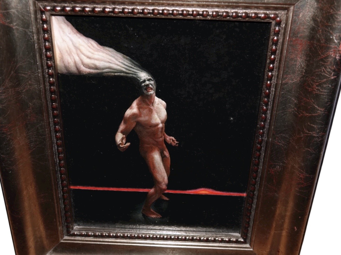 Ville Löppönen (born 1980 in Finland) acrylic and oil painting of a nude man in a wide silver frame from 2010.Most likely from the exhibition called "Killed My God" that took place in 2012 in Gallery Kalhama & Piippo Contemporary in Helsinki, Finland.
