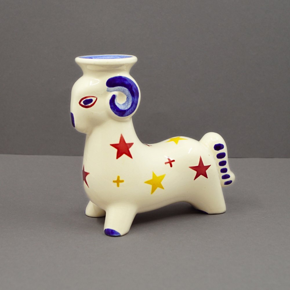 Aluminia; Christmas deer in faience. In blue, red and yellow. For one candle. H. 10 cm. L. 11 cm.Aluminia faience Denmark.