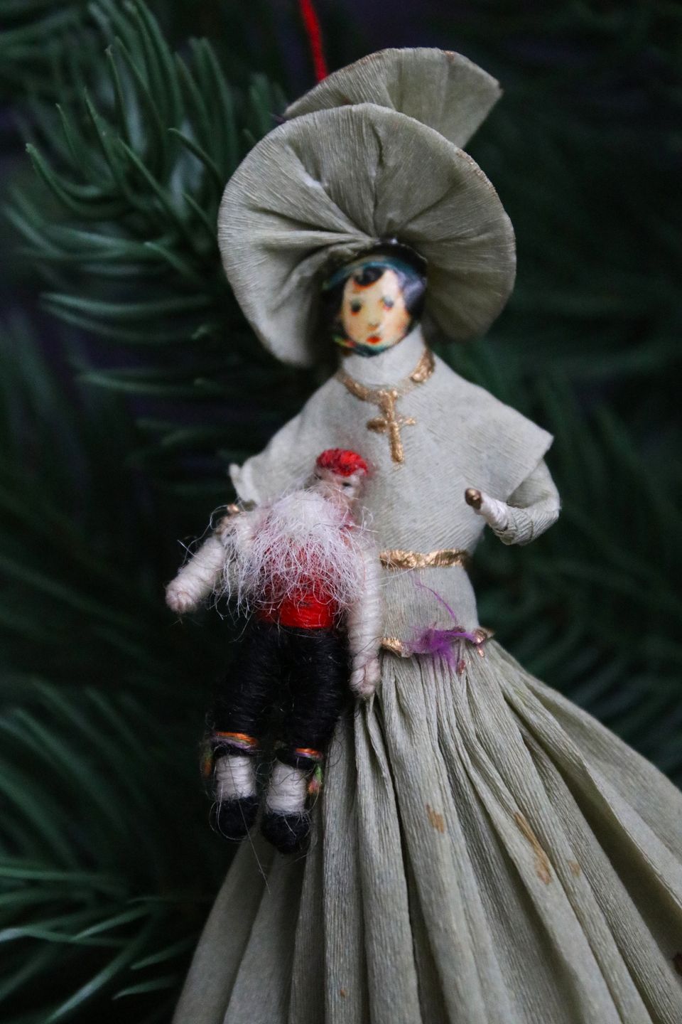 Old Christmas tree ornament, nice lady holding a small Santa Claus doll, made of colored crepe paper. H: 15cm.Item number: Jul nr. 648