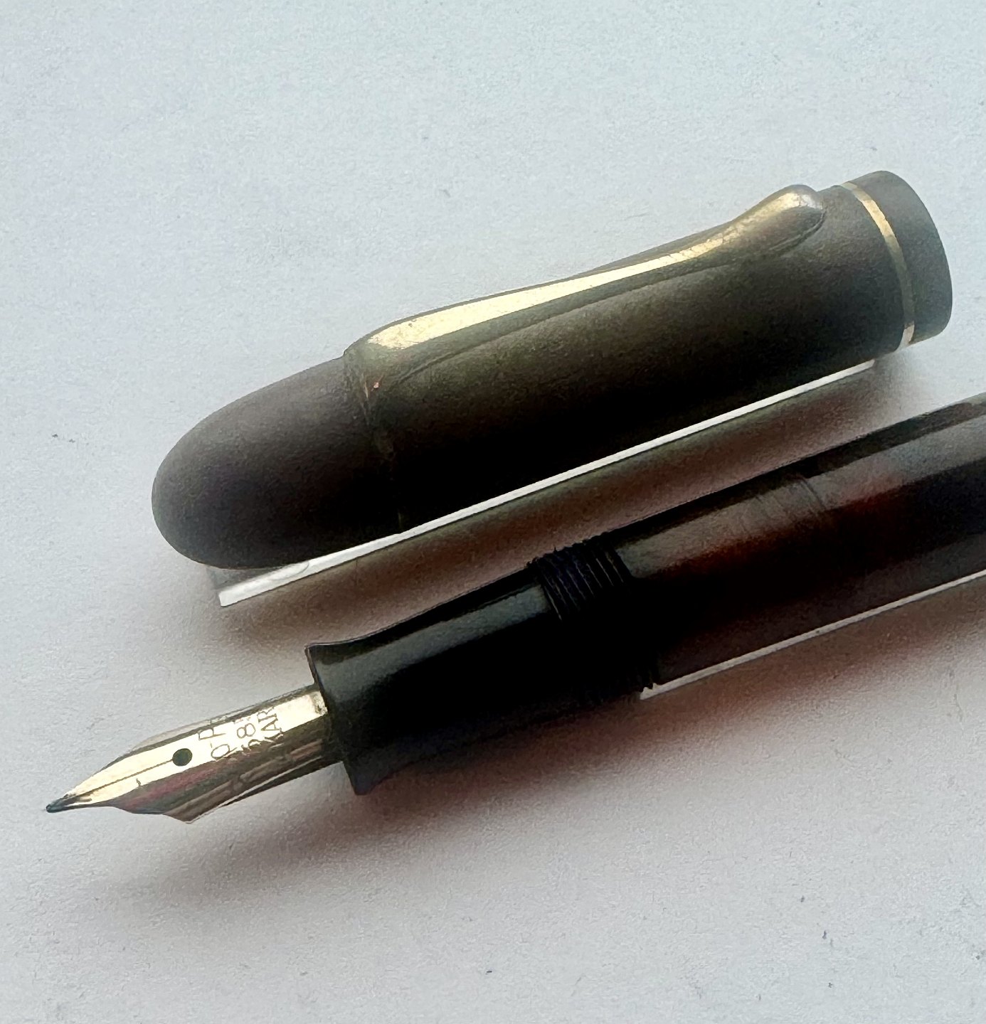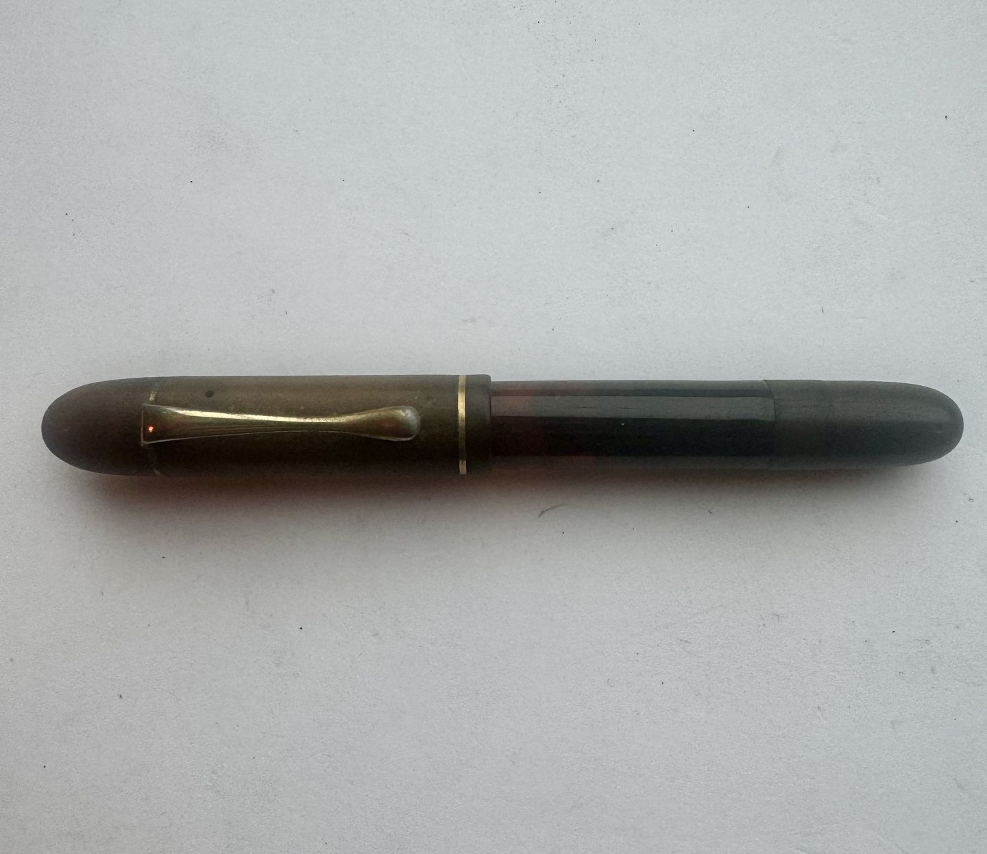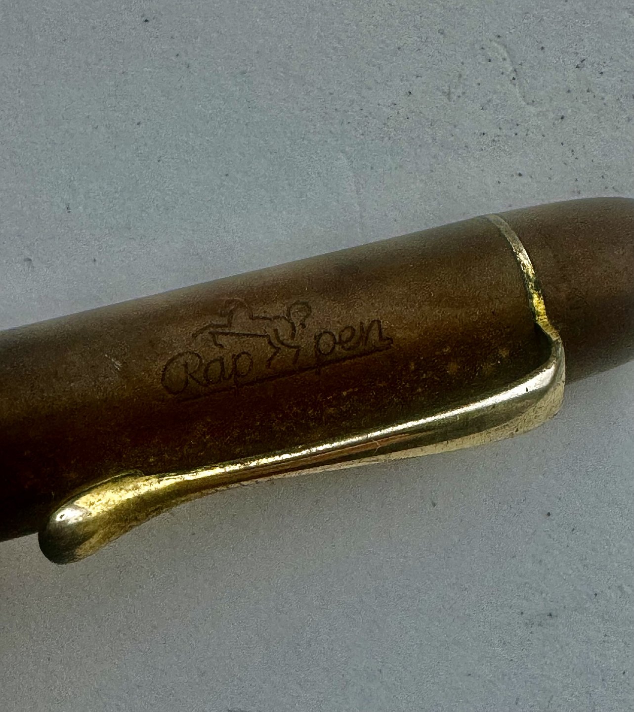 Black Rappen fountain pen from the early 1930s. Piston ink refill with transparent ink window. The piston moves back and forth when the bottom screw is activated, but it cannot absorb ink, which is why it must be restored before it can function as a fountain pen again. The cap is discolored, which is why it is not quite the same color as the rest of the pen. Made by Pelikan in Germany, which the pen's design actually reveals. L 11.2 cm Dealer