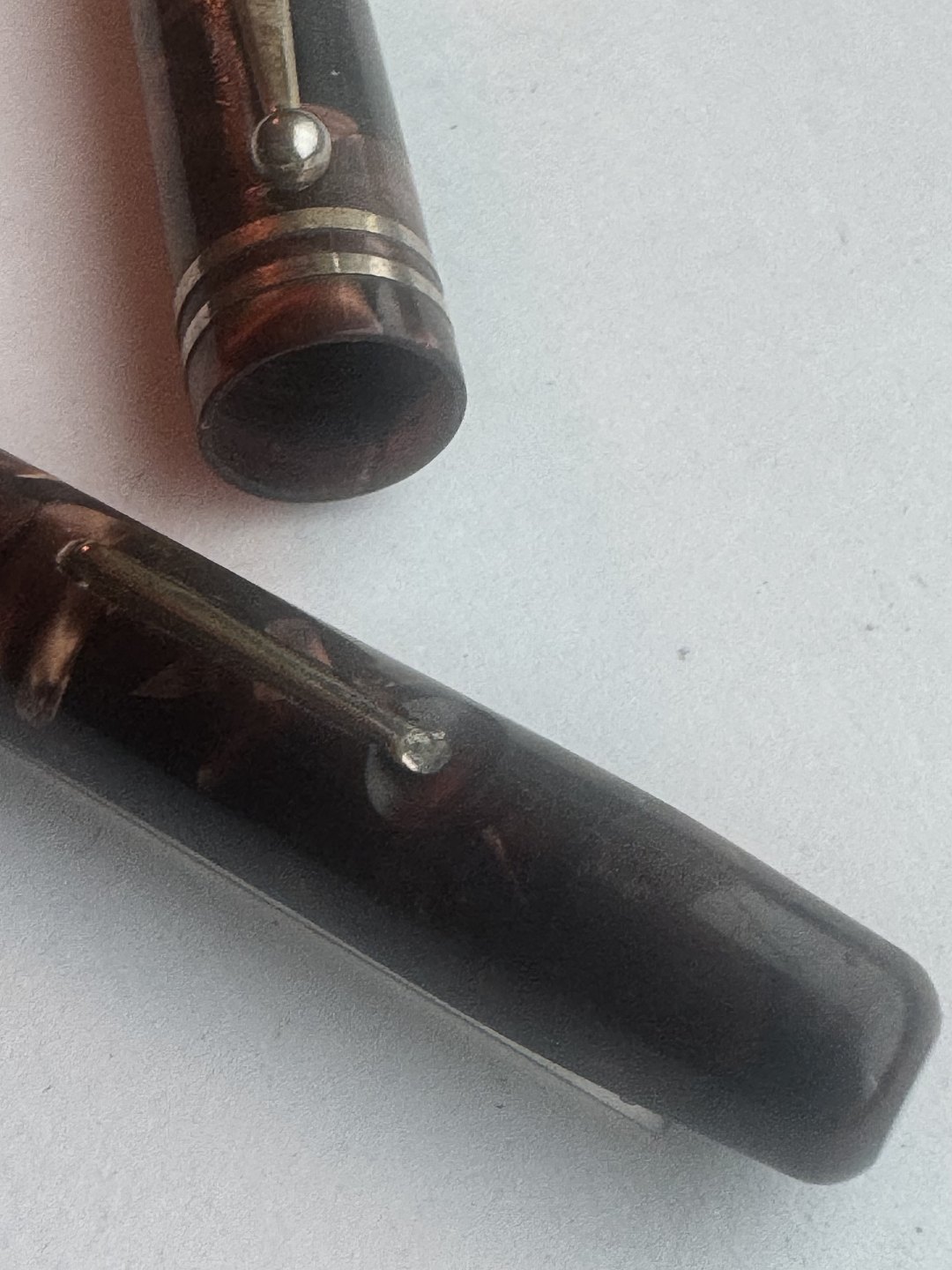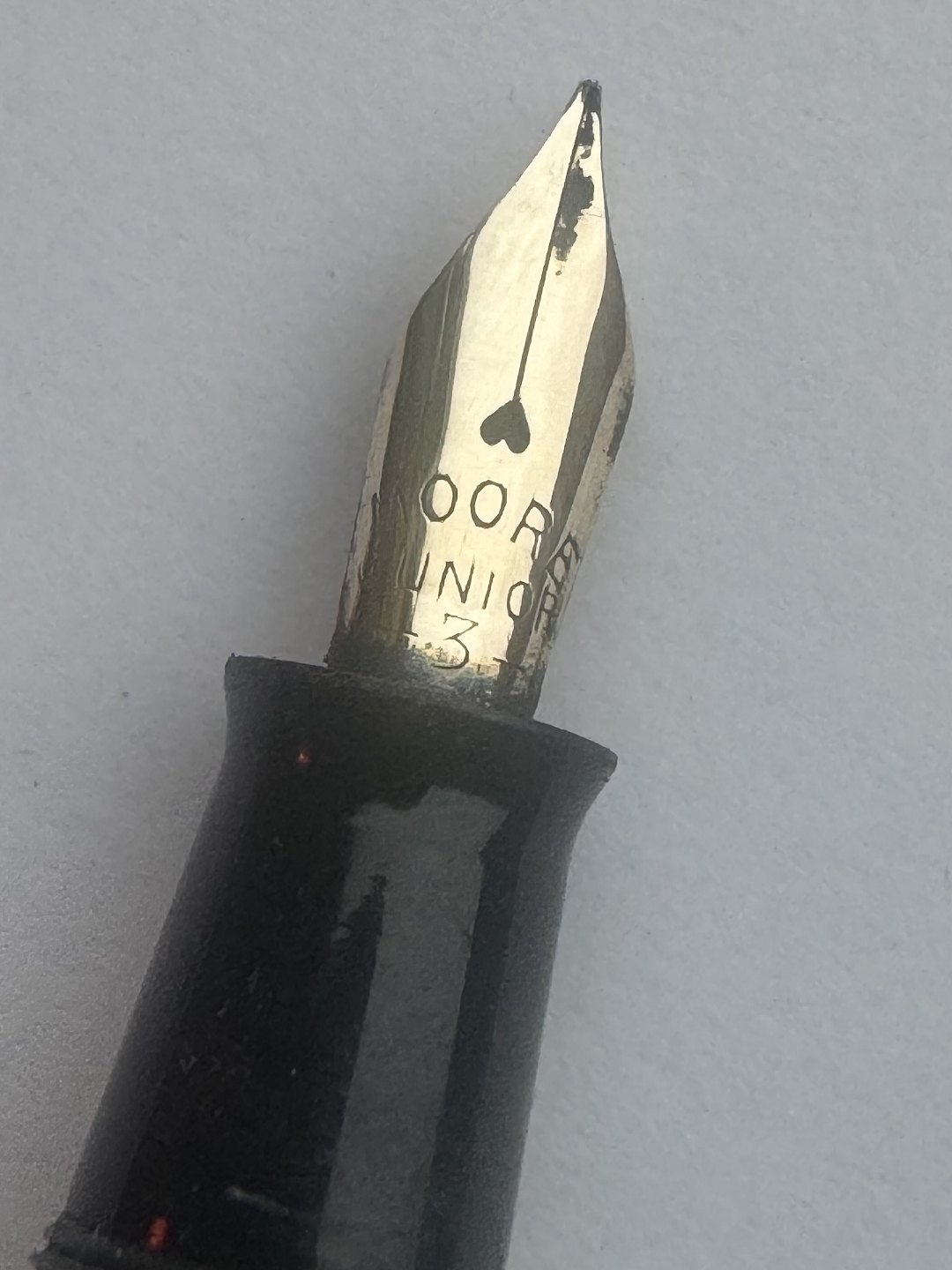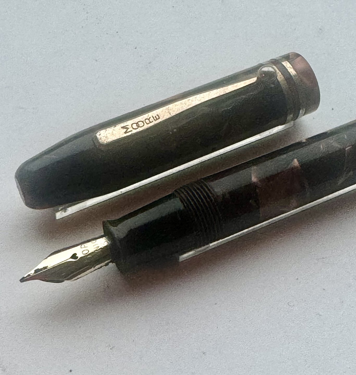 Green marbled fountain pen with lever filler from The Moore Pen Company. Made in the U.S.A. around 1940. Does not work. A new rubber sack must be inserted before it can absorb ink and write again. The fountain pen otherwise appears in good condition without damage or repairs. All parts are original and from the original period.