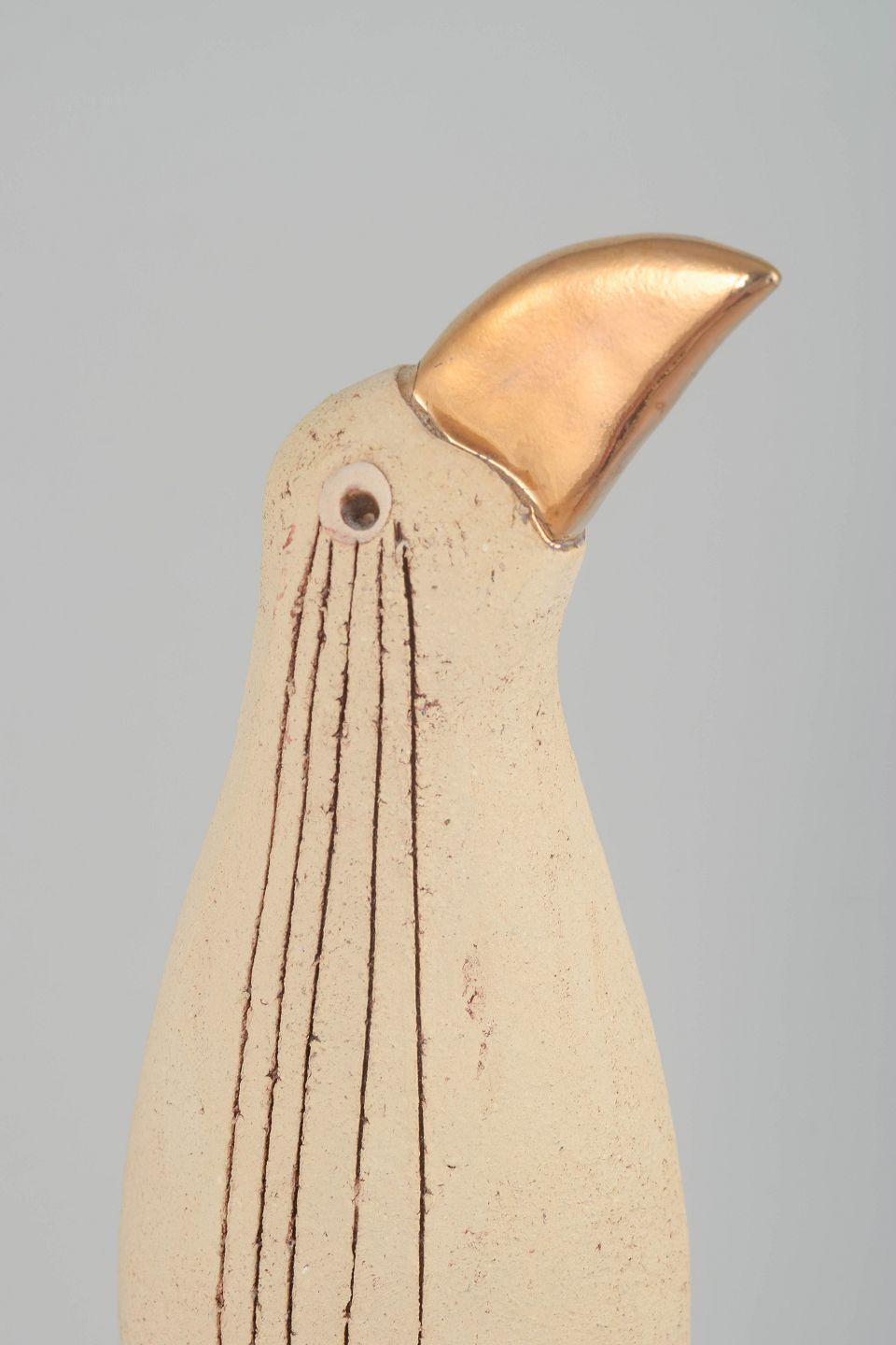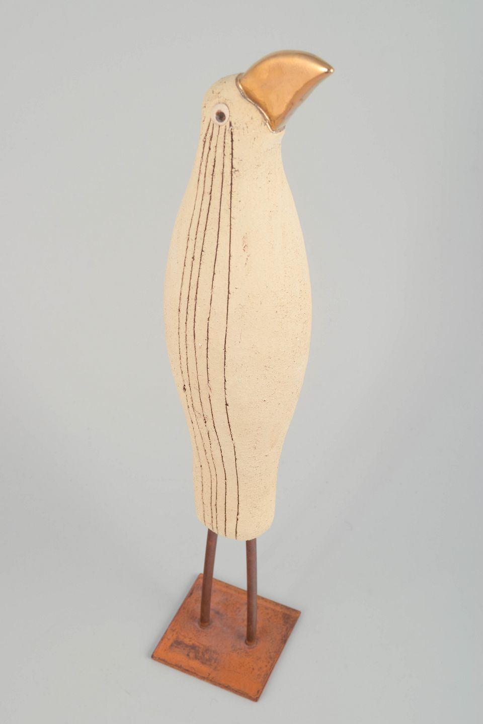Elegant bird-shaped sculpture in hand-modelled stoneware with a light, slightly rough surface and incised linear decoration, mounted on metal legs with an iron base. The metallic-glazed beak provides a striking contrast to the matte body. Signed by the artist.