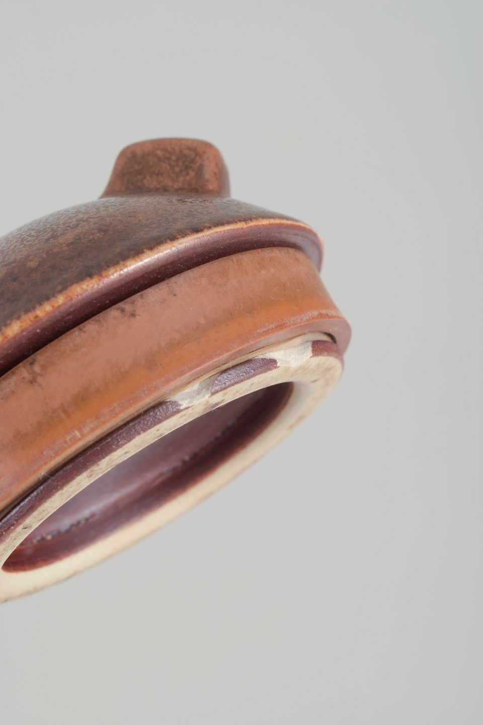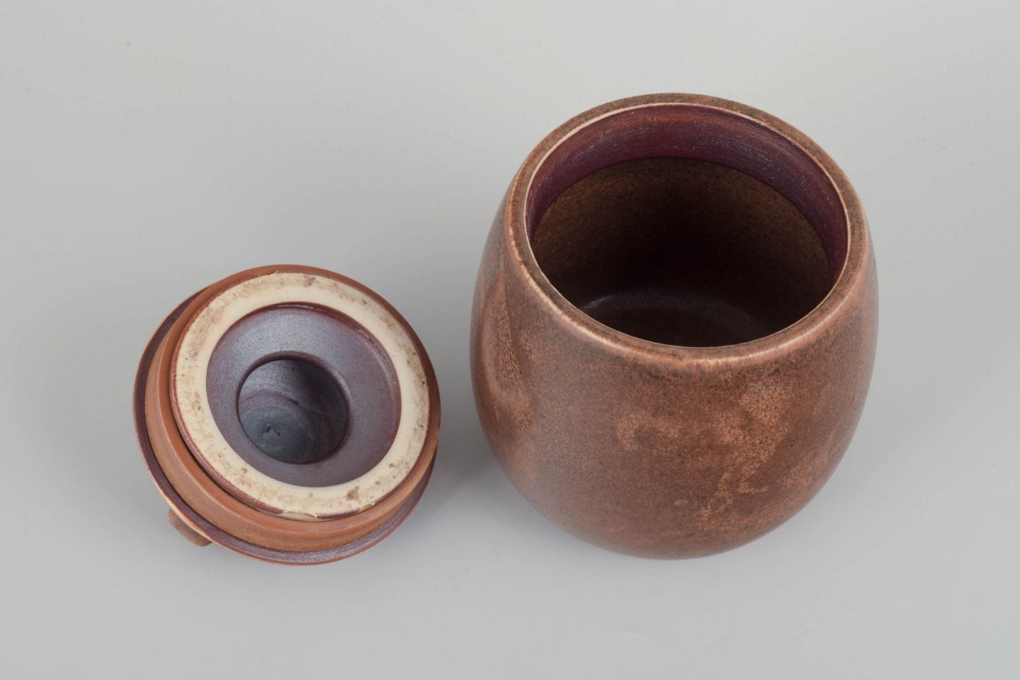 Organically shaped stoneware lidded jar with a matte brown glaze in warm earthy tones. The lid features two small handles, characteristic of Saxbo’s functional yet sculptural design language. A fine and balanced example of Rahr’s work for Saxbo.
