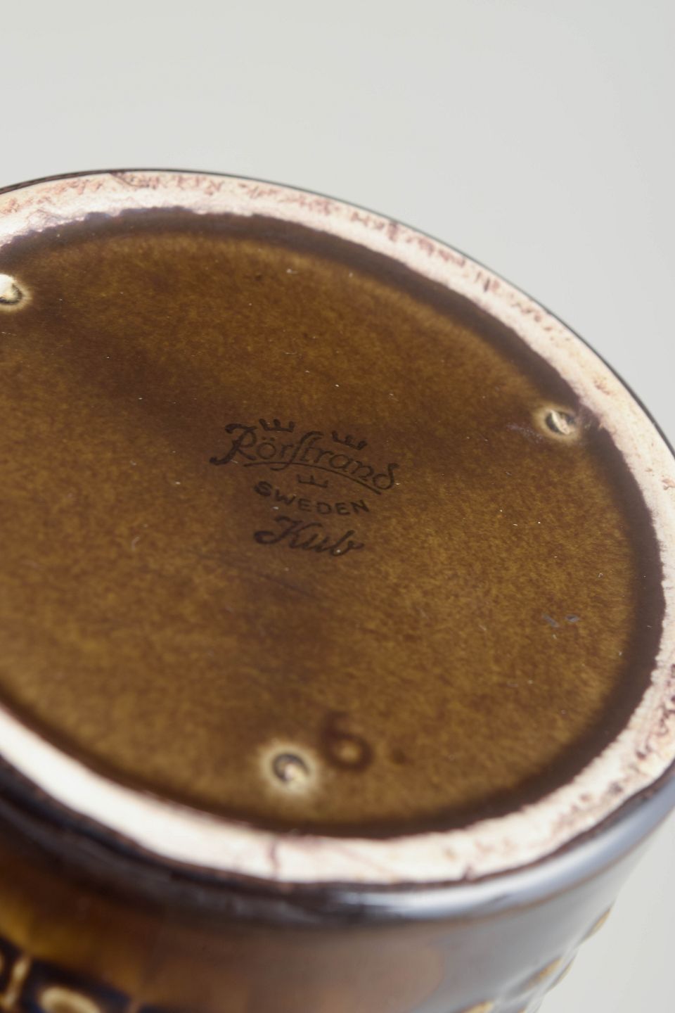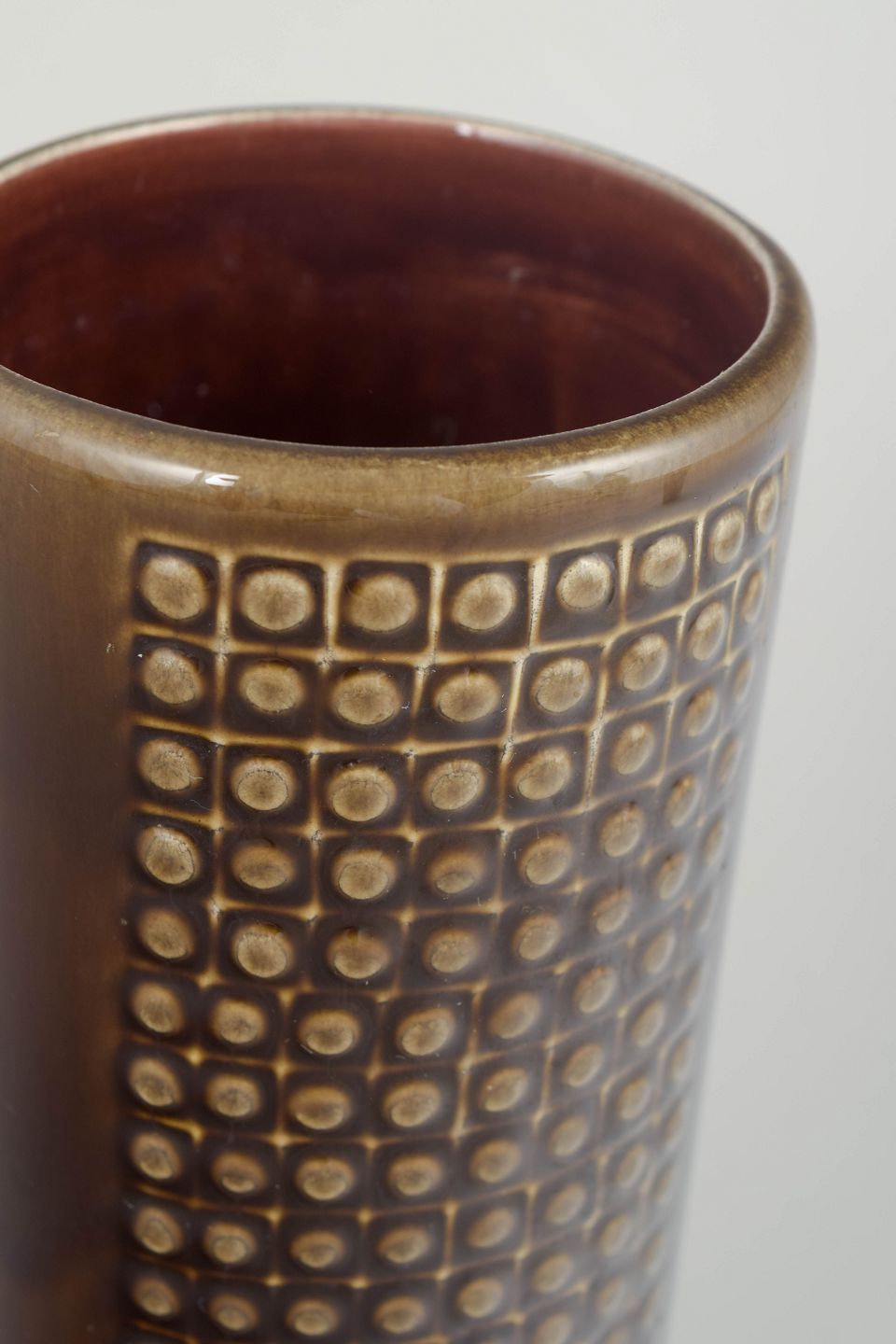 Cylindrical stoneware vase with characteristic grid relief and brown glaze with golden hues. A classic example of Nylund’s modernist design language from the 1960s.
