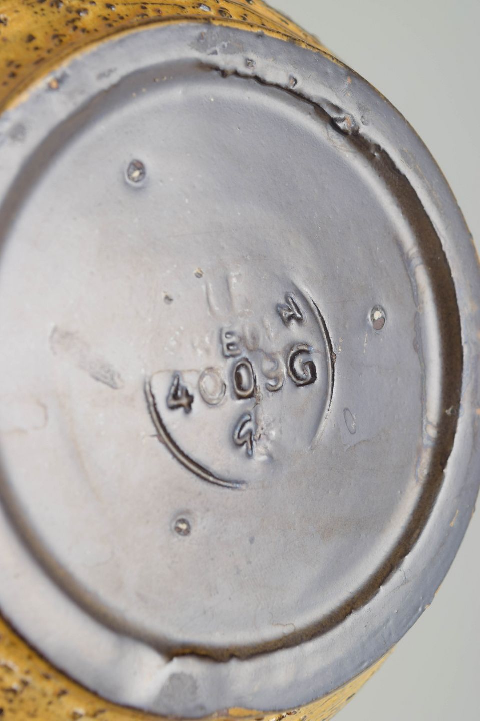 Hand-thrown stoneware vase with a cylindrical body and small neck, decorated in a vivid yellow-brown glaze with dark textured markings giving the surface a striking rustic character. A fine example of Andersson’s craftsmanship and the experimental glazing aesthetics of Upsala Ekeby during the 1960s.