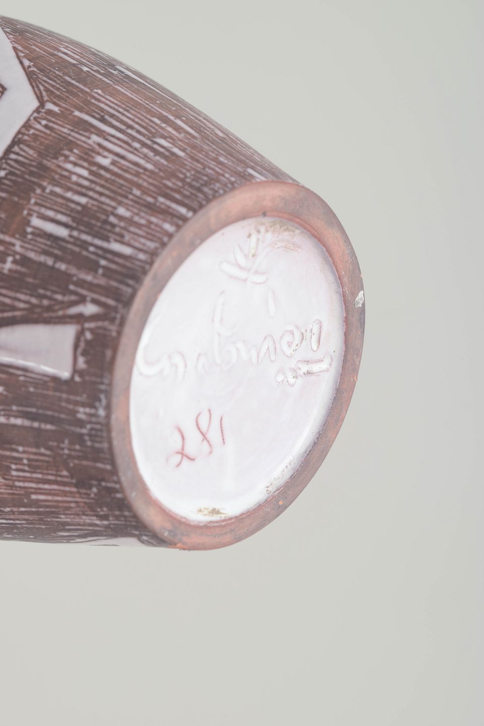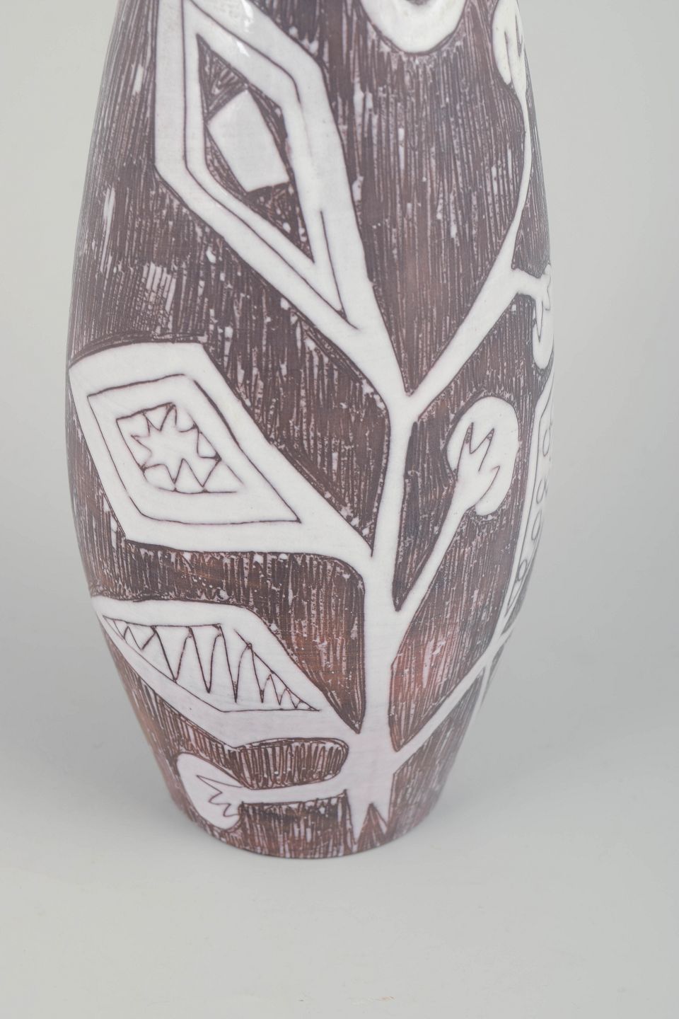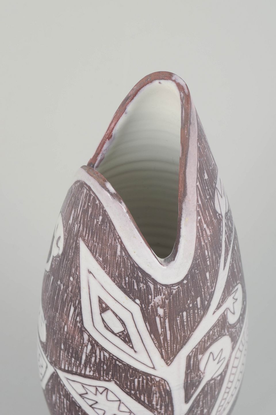Handmade ceramic vase with a distinctive asymmetrical form and incised graphic decoration beneath a brown and white glaze. A characteristic example of Swedish studio pottery from the 1960s, marked by strong artistic individuality.