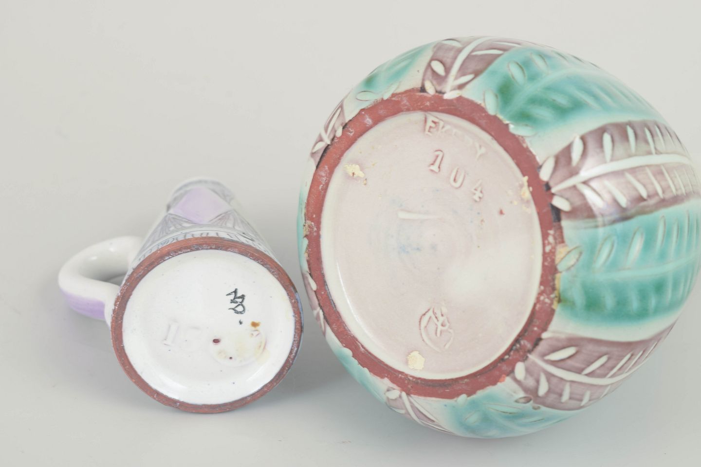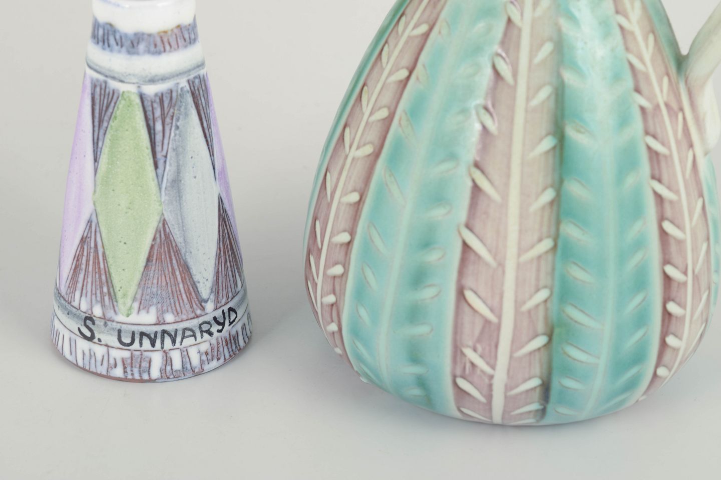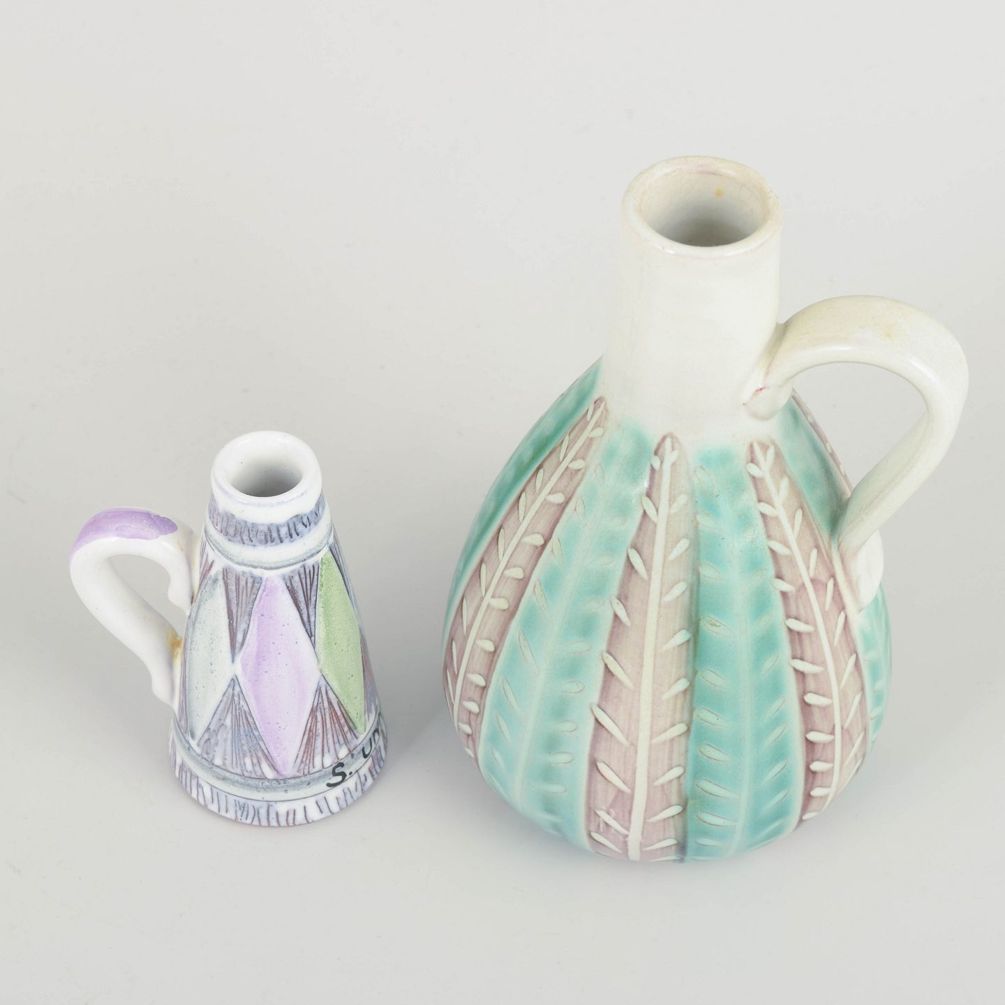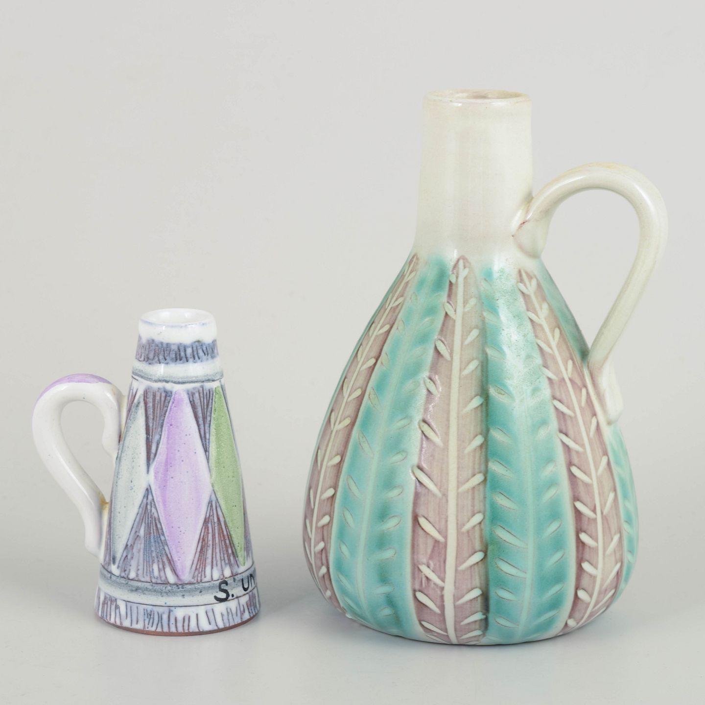 Beautiful ceramic pitchers designed by Ingrid Atterberg and Mari Simmulson for Upsala Ekeby. Both decorated in pastel tones with incised patterns and hand-painted glaze. The two pieces exemplify the distinctive style and refined colour sensibility characteristic of Swedish ceramics from the 1960s.