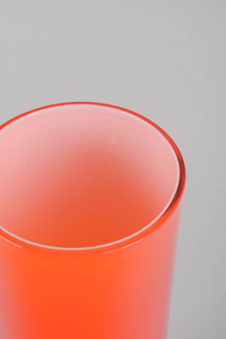 Elegant mouth-blown vase in bright orange glass with a tall, cylindrical shape. A typical example of Swedish glass art from the 1970s, where clean lines and vivid colour defined the design language of the era.