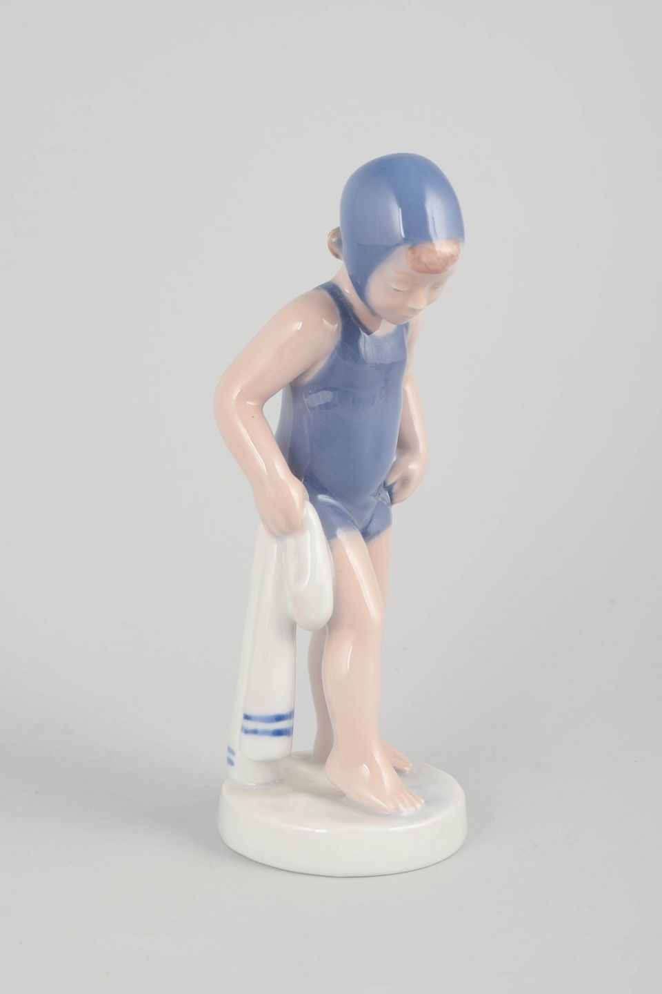 Porcelain figurine of a young girl in a blue swimsuit and bathing cap, standing on a round base holding a towel. Classic Royal Copenhagen porcelain in soft pastel tones.