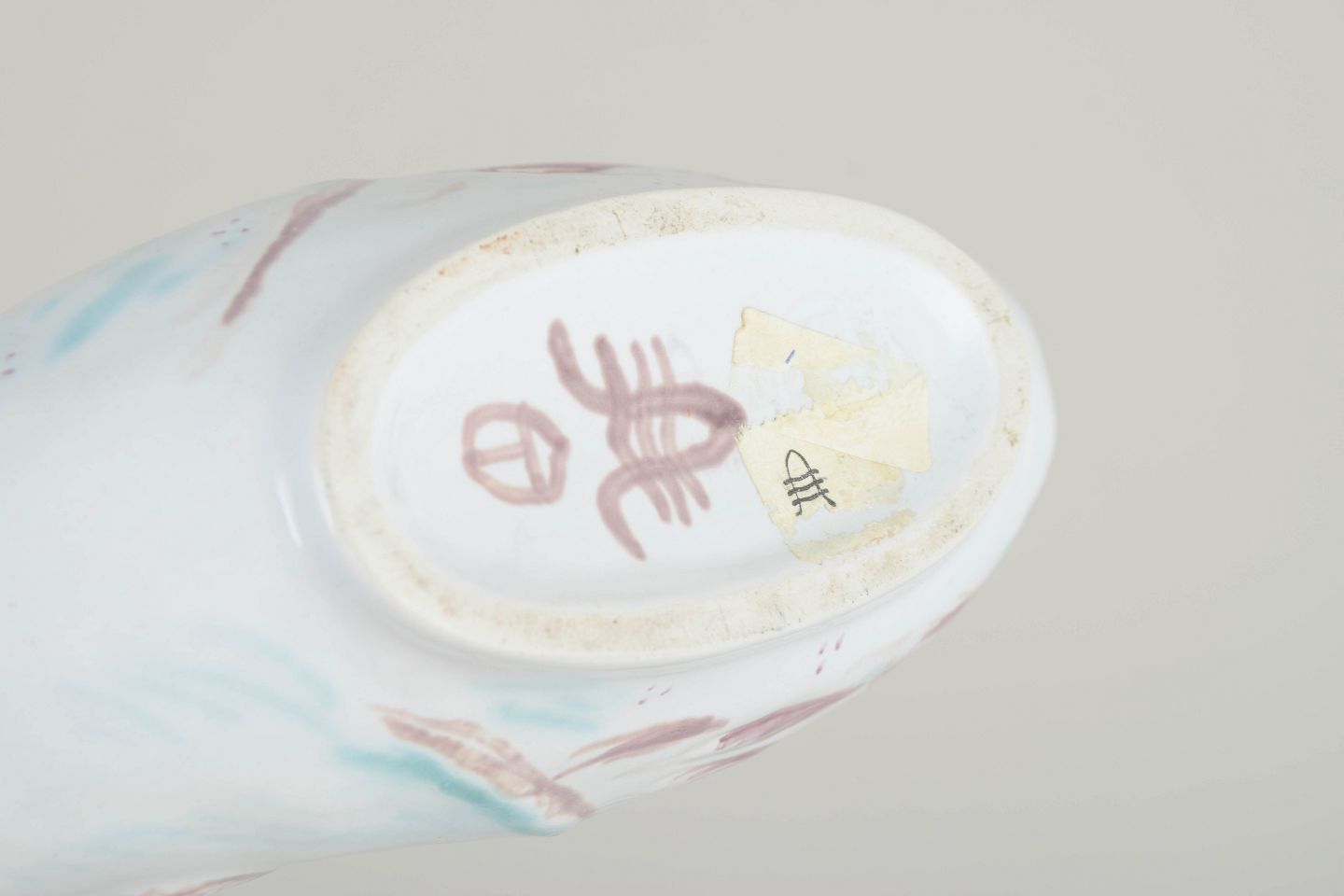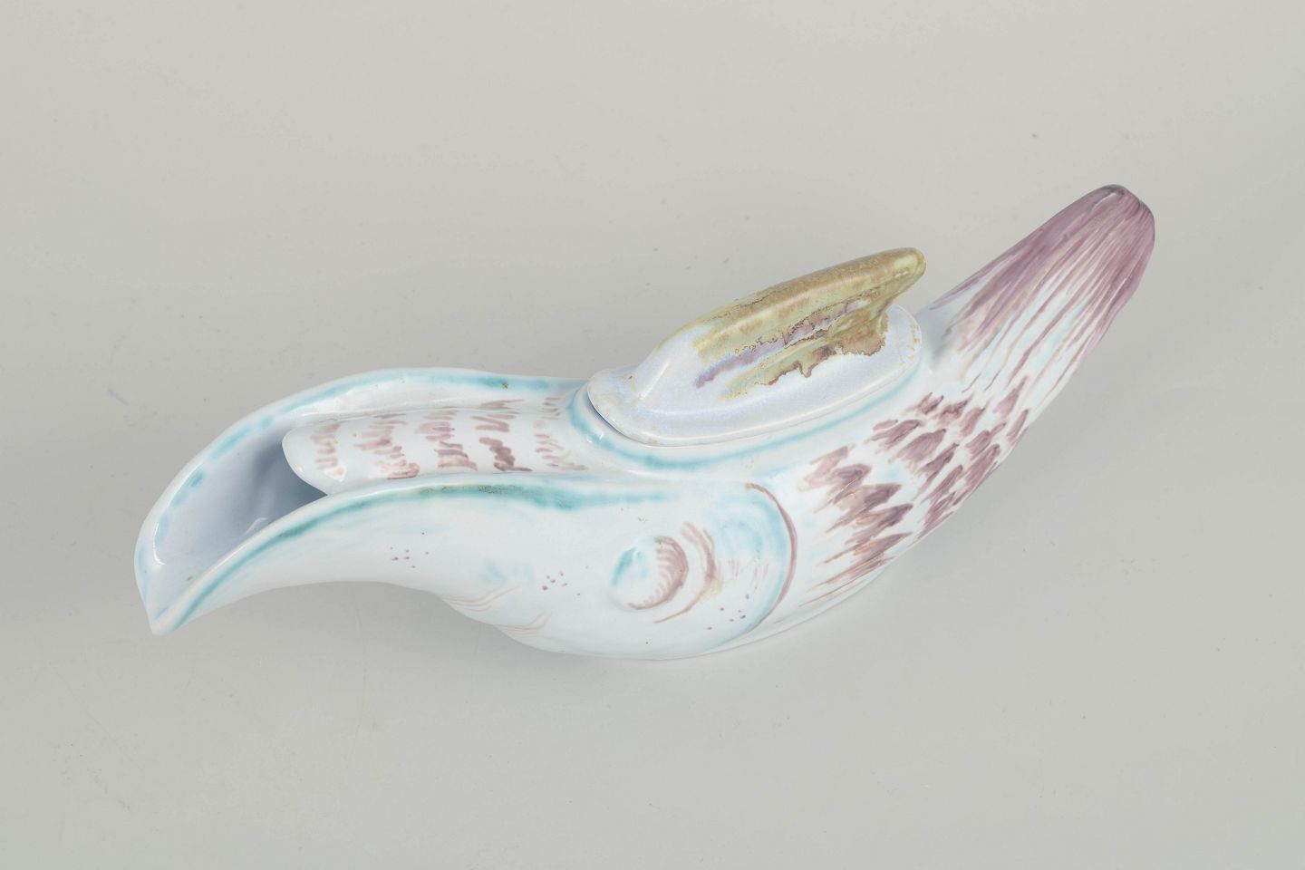 Figurative sauce bowl shaped as a bird, executed in faience with hand-painted decoration in light blue, pink and golden tones. A charming example of Aluminia’s playful mid-century design language.