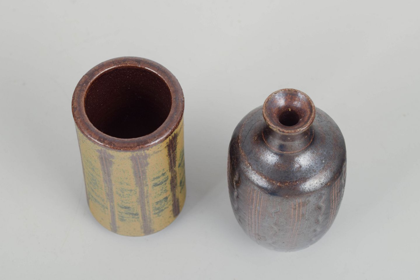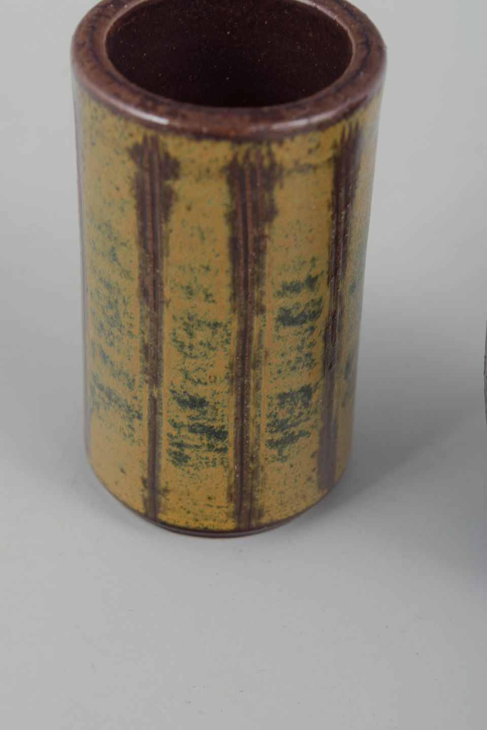 Two hand-thrown miniature vases in stoneware with experimental glazes in brown, green, and golden tones. A fine example of Swedish studio pottery, displaying refined proportions and vibrant glaze variation.
