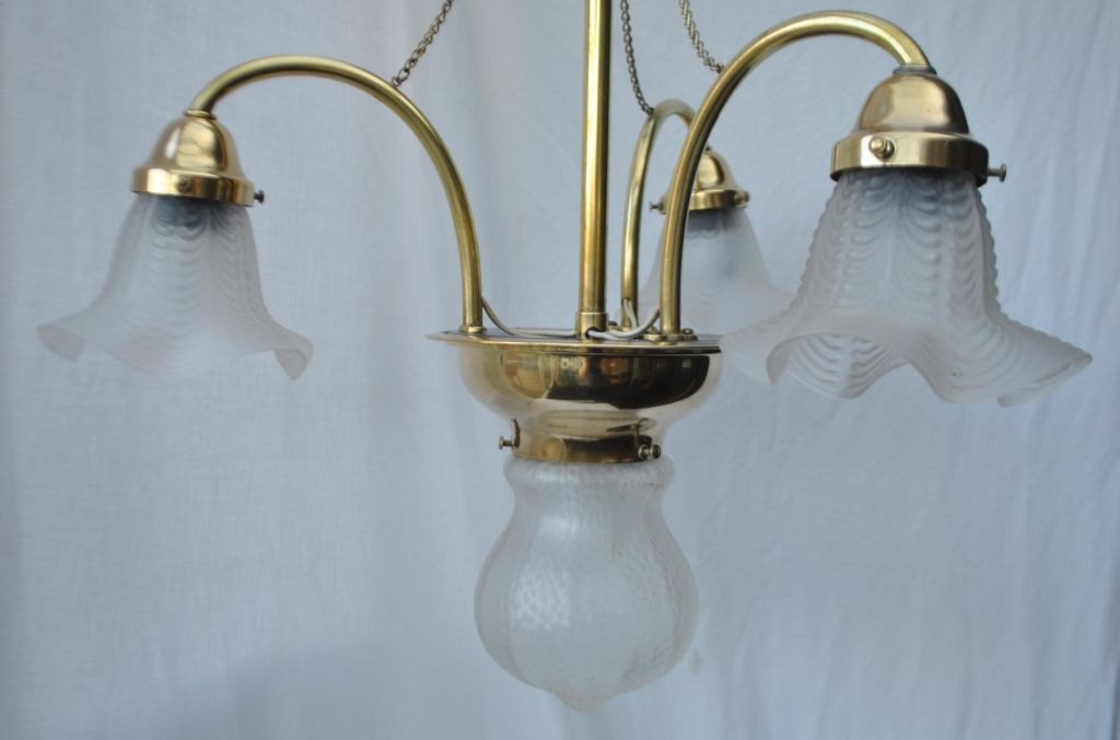 Danish Art Nouveau lamp in brass with four domes, approx. 1910. Center dome onion-shaped in frosted glass. 3 ruffled frosted lamp glasses in each light arm. With three hanging chains. H.: 80 cm. Dia.: 50 cm. All domes from Funen Glassworks. Fantastic condition. Provenance: Samsø.Item number: 28526