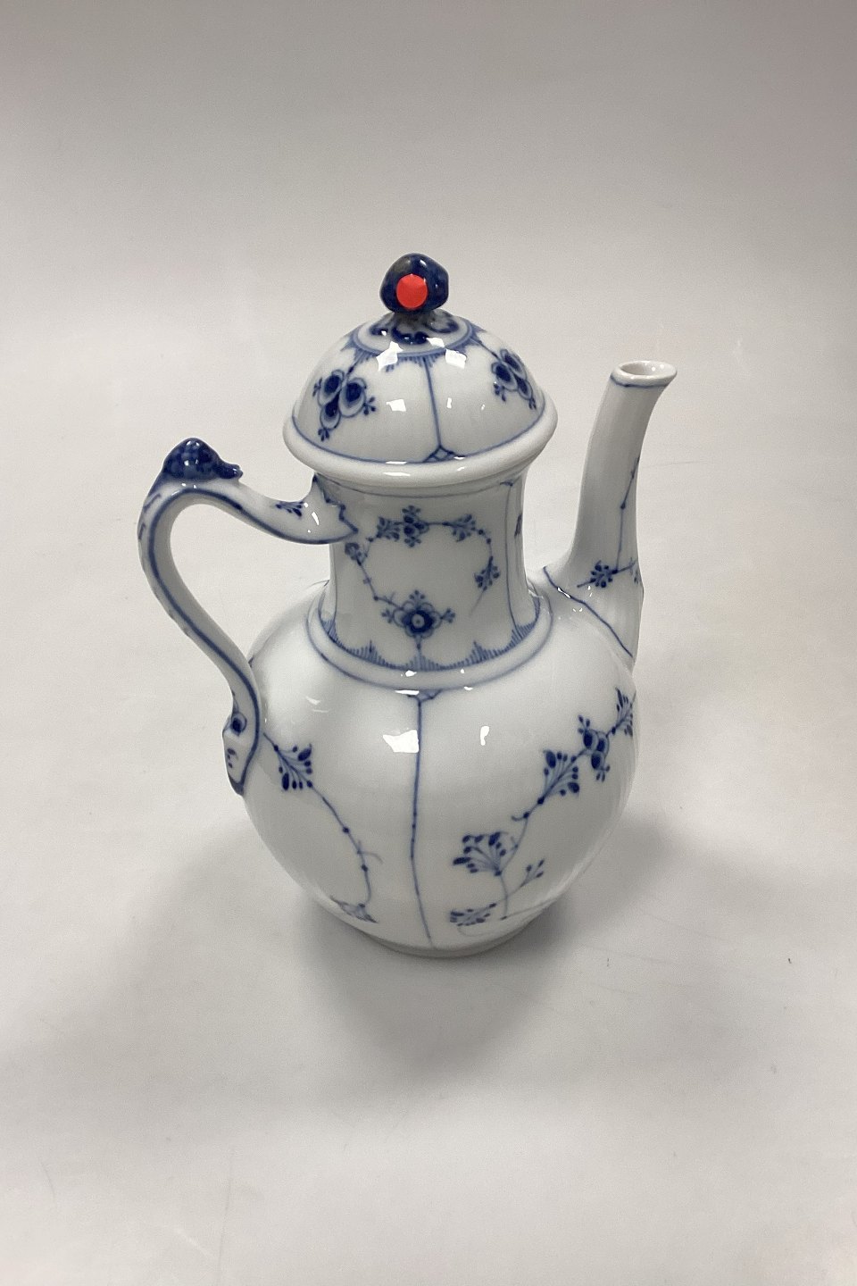 Royal Copenhagen Blue Fluted Plain Large Coffee Pot No. 481st Quality. Has a chip on the top of the lid. Has a repair in the lid (screwed together). Has a hairline crack in the bottom of the pot