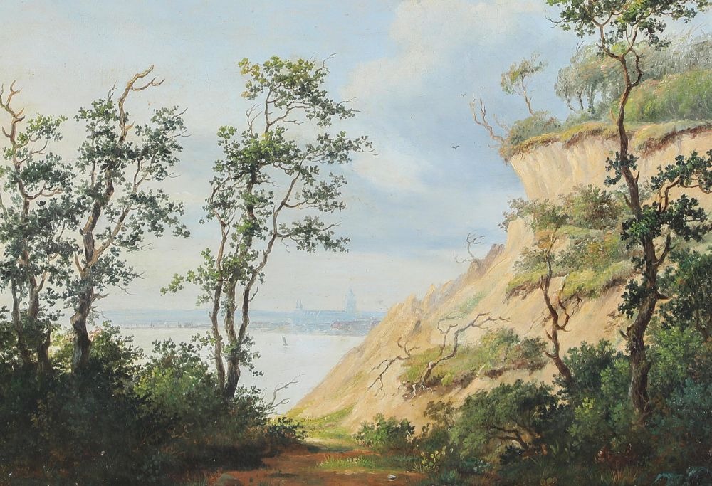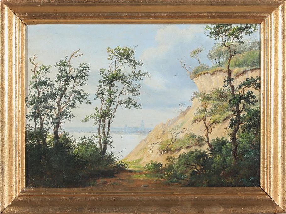 Holm, Peter (1798 - 1875) Denmark. Summer landscape with Aarhus Bay and the city, seen from the slopes of Risskov. Oil on metal plate. Signed P. Holm (ntv) 18 x 25 cm.Framed in a small gilded wooden frame 22.5 x 30.5 cm.