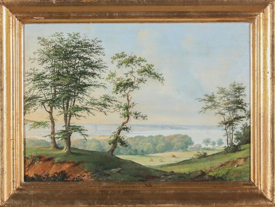 Holm, Peter (1798 - 1875) Denmark: Summer landscape with a view of Aarhus Bay and the city. Seen from Frederikshøk, Højbjerg. Oil on metal plates. Signed: PH 1846. 18 x 25 cm.