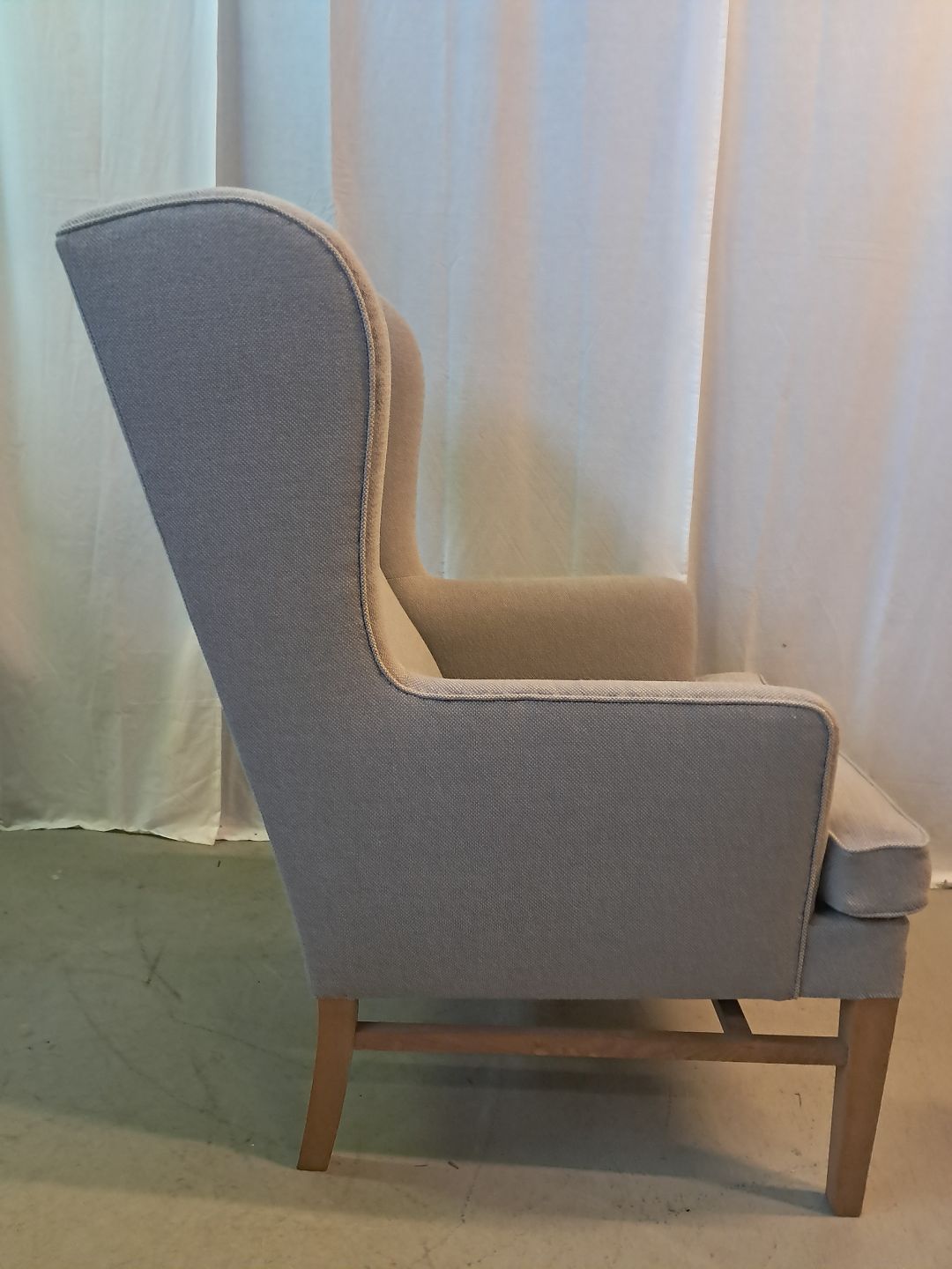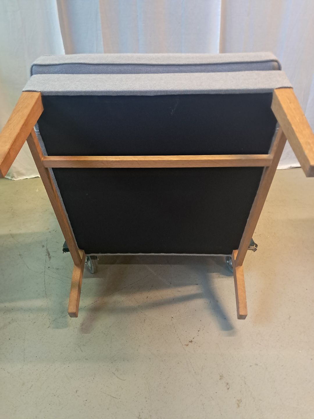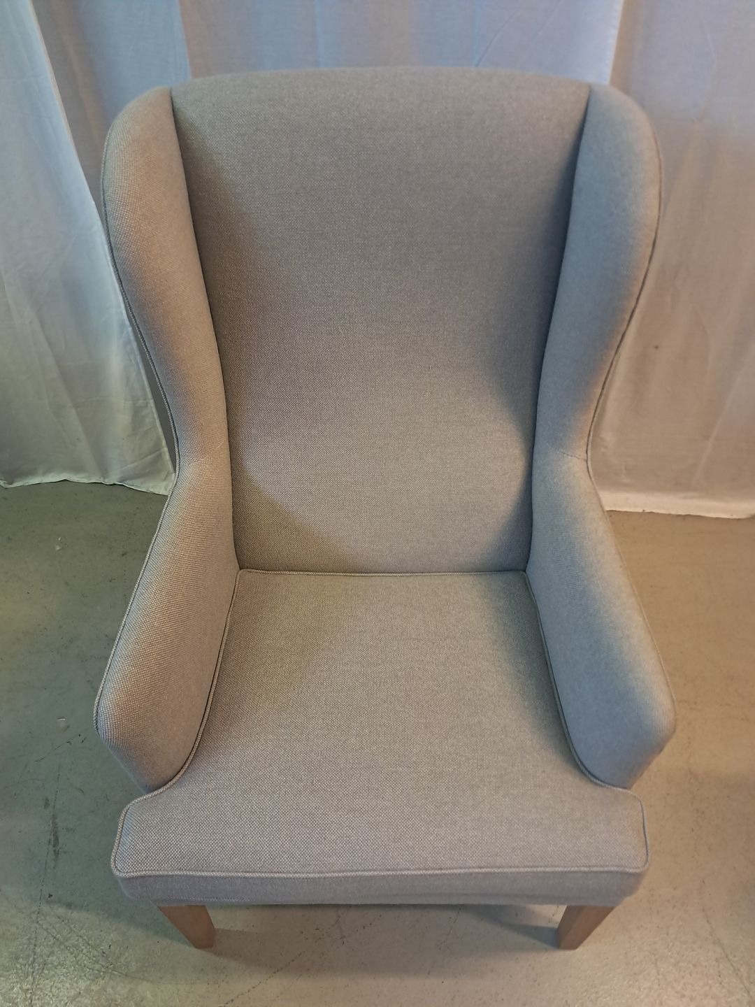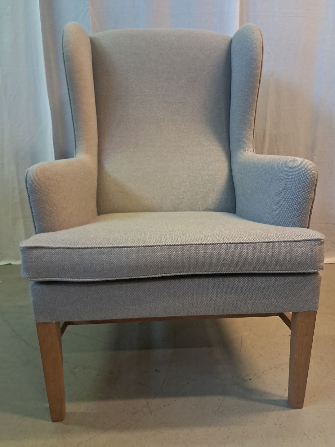 Lænestol med stofbetræk og ben i egetræ, fra 2000erne.
