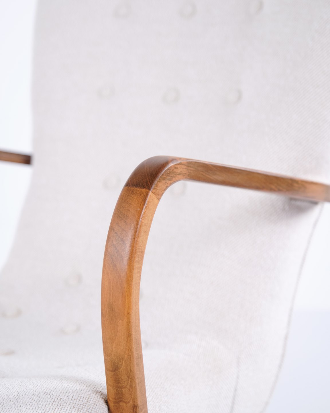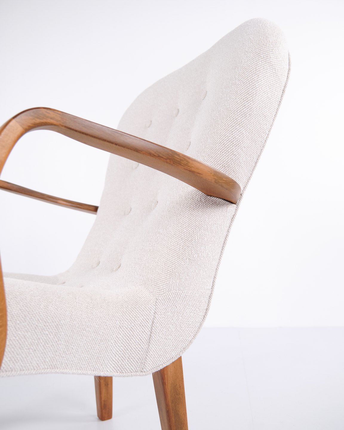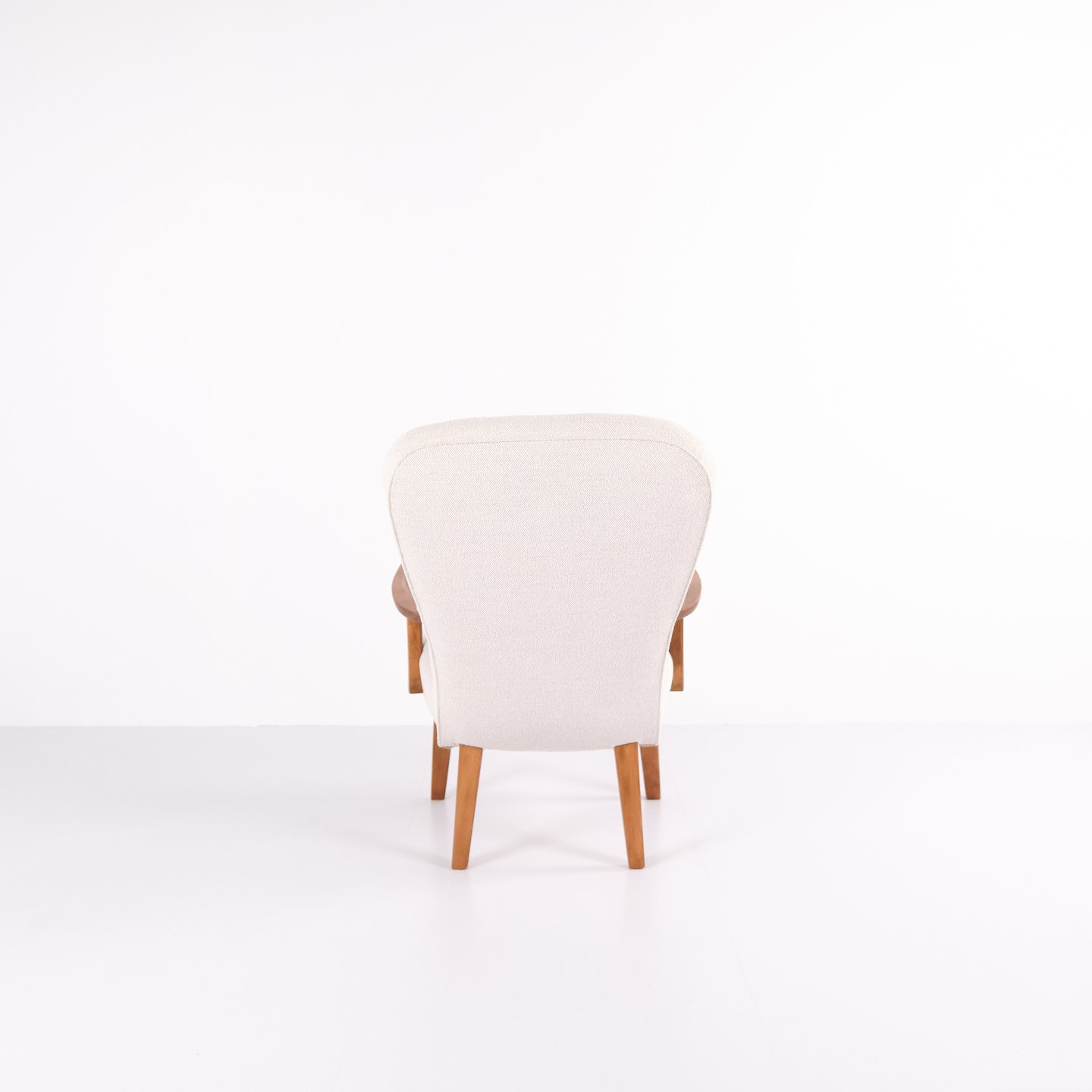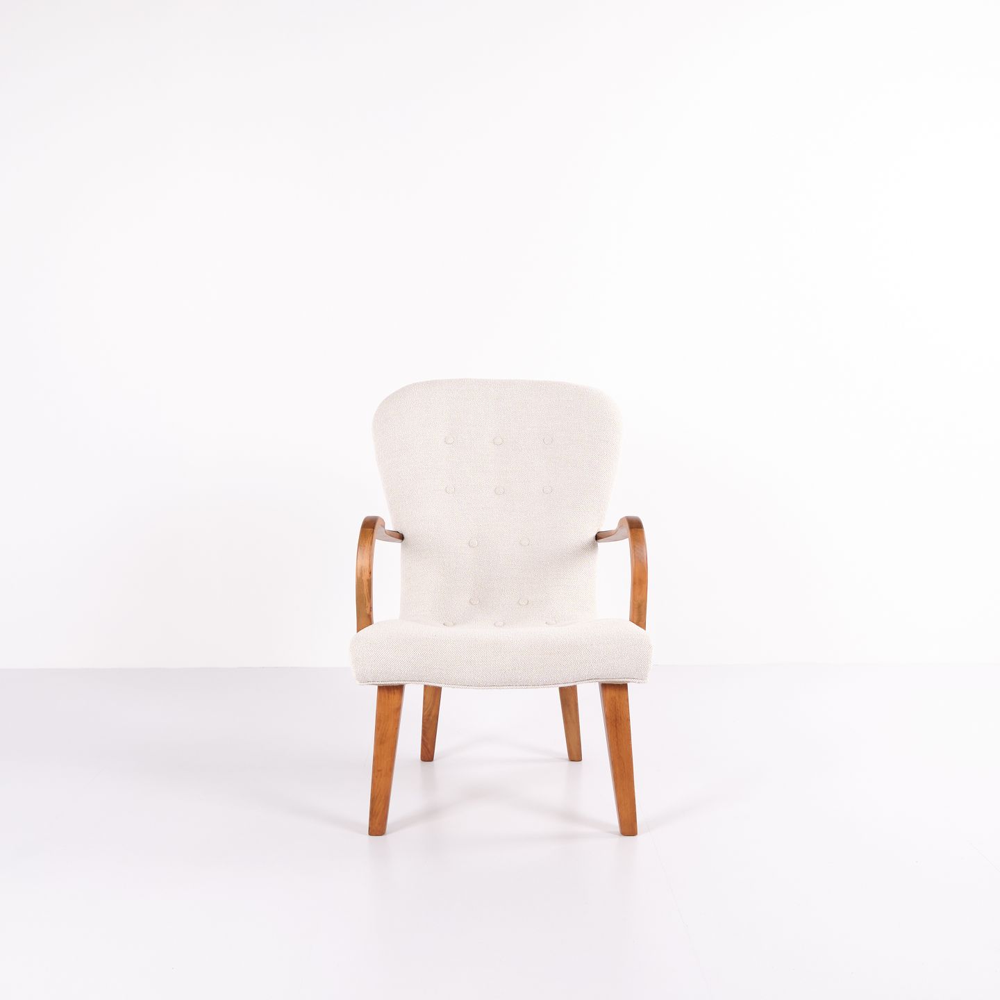 Classic armchair from the 1940s, upholstered in light fabric and made in a period-typical, rounded design. The chair has an elegant, upright back and slightly curved armrests.— Origin: Denmark