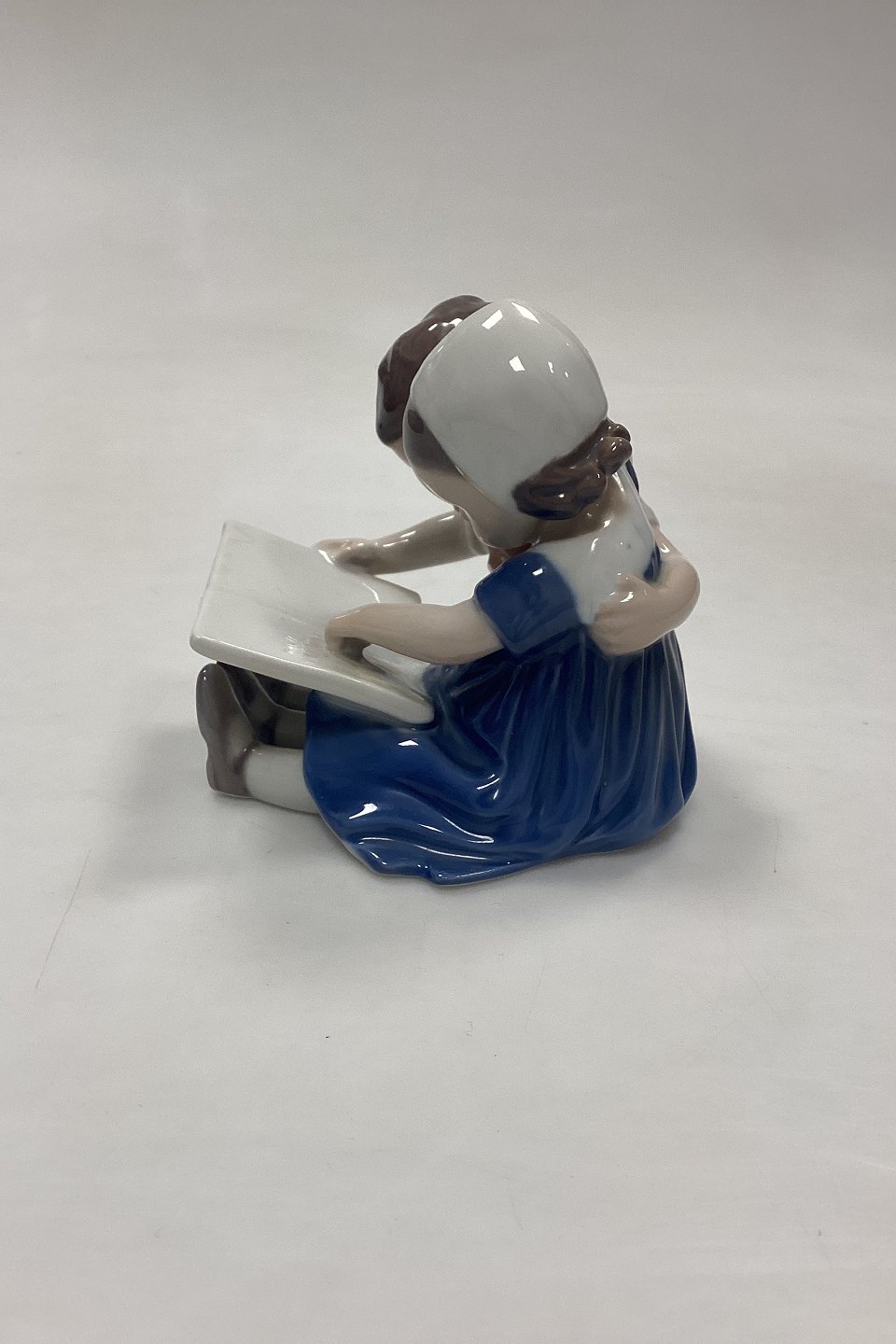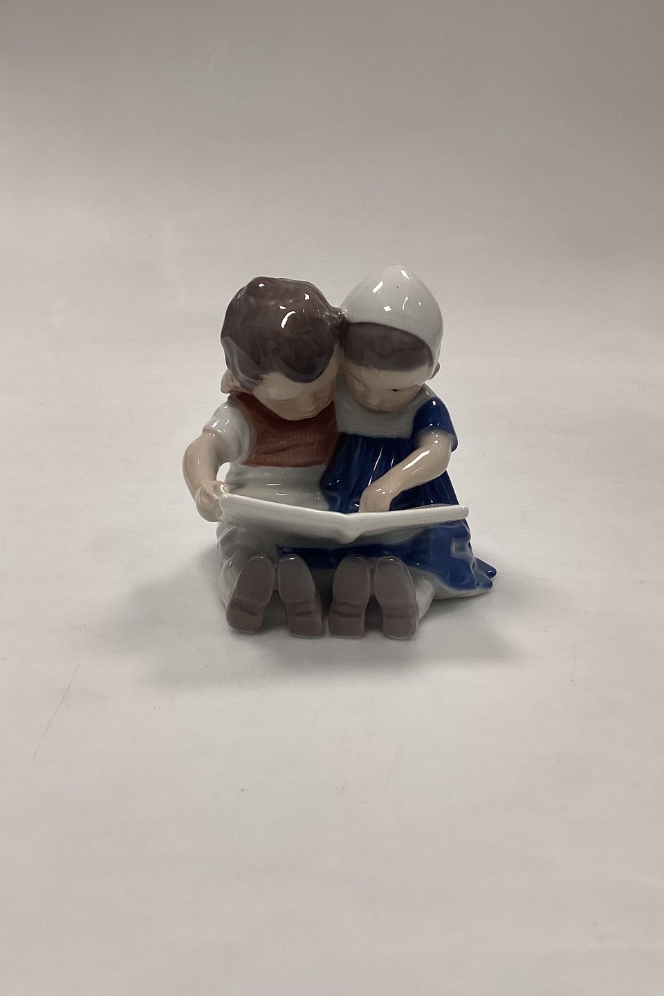 Royal Copenhagen Figurine Children Reading No. 402. Designed by Ingeborg Plockross Irminger.Measures 10 cm / 3.93 in. 3rd Quality. Glaze flaw on the bonnet, see photo.