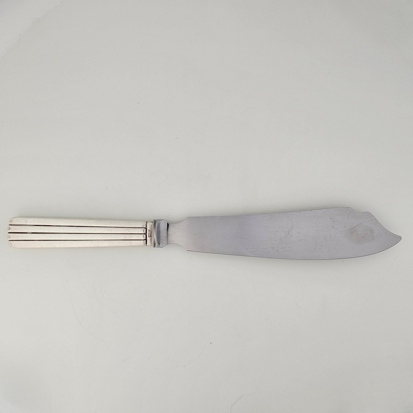 Bernadotte lagkagekniv i sterling sølv, med rustfrit stål skaft dekoreret med striberFormgiver Sigvard Bernadotte (1939)