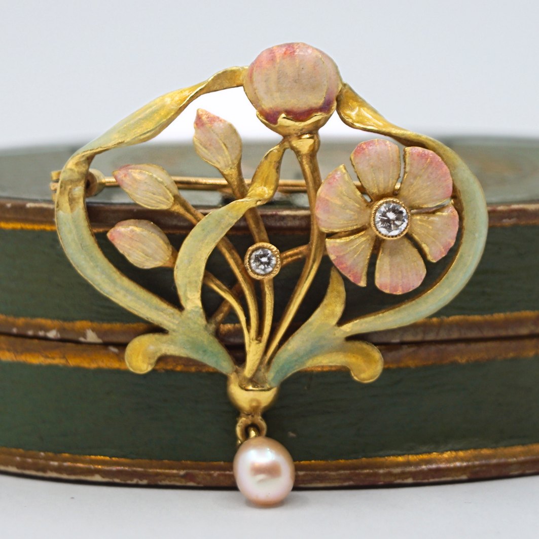 An Art Nouveau brooch in 18k gold with enamel, diamonds and pearl