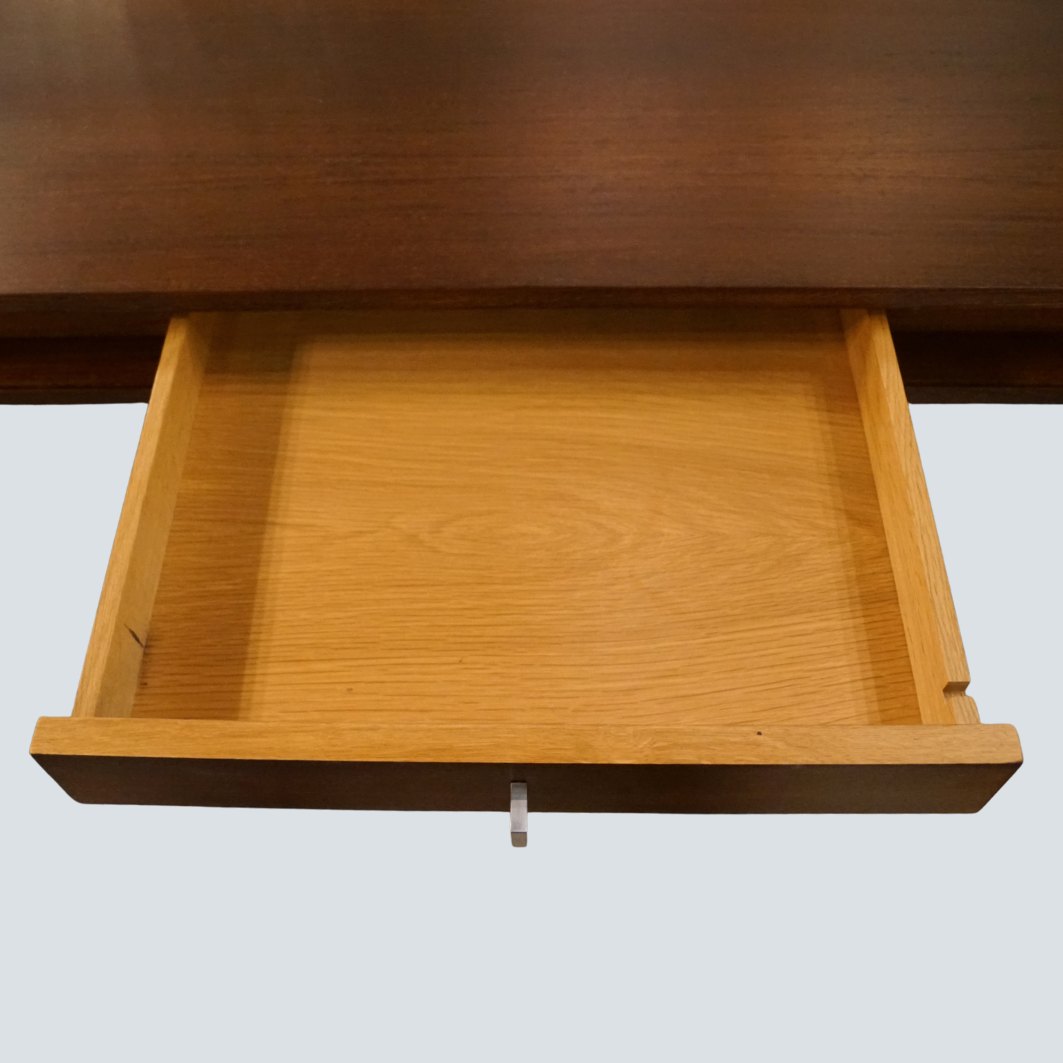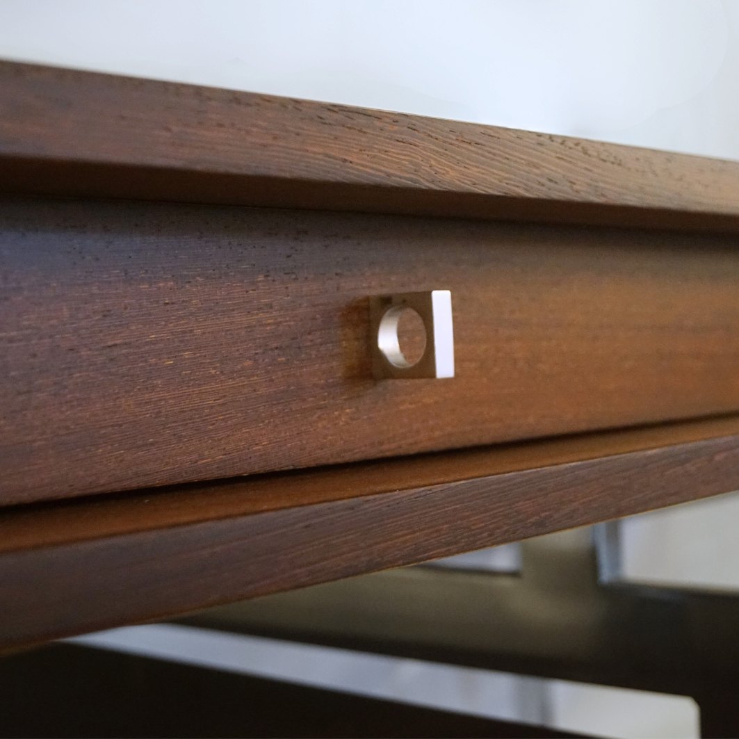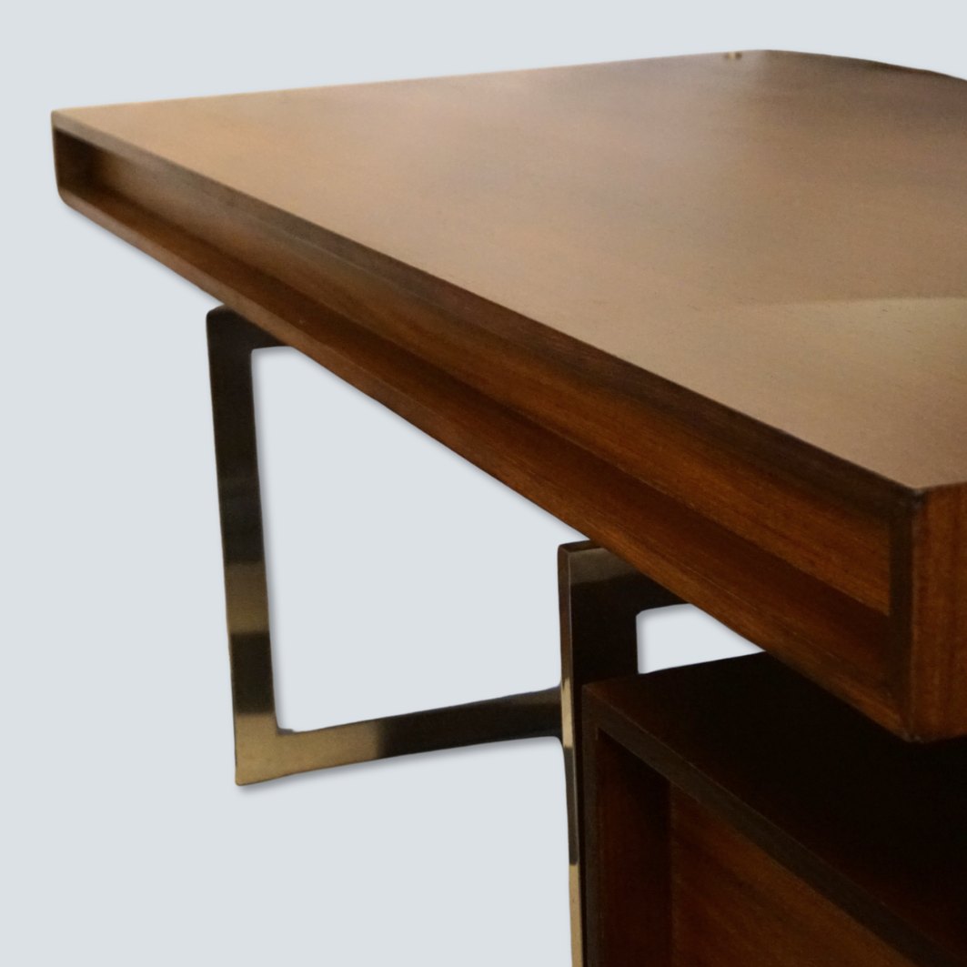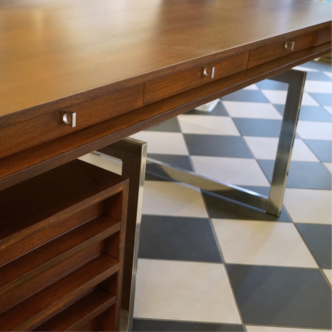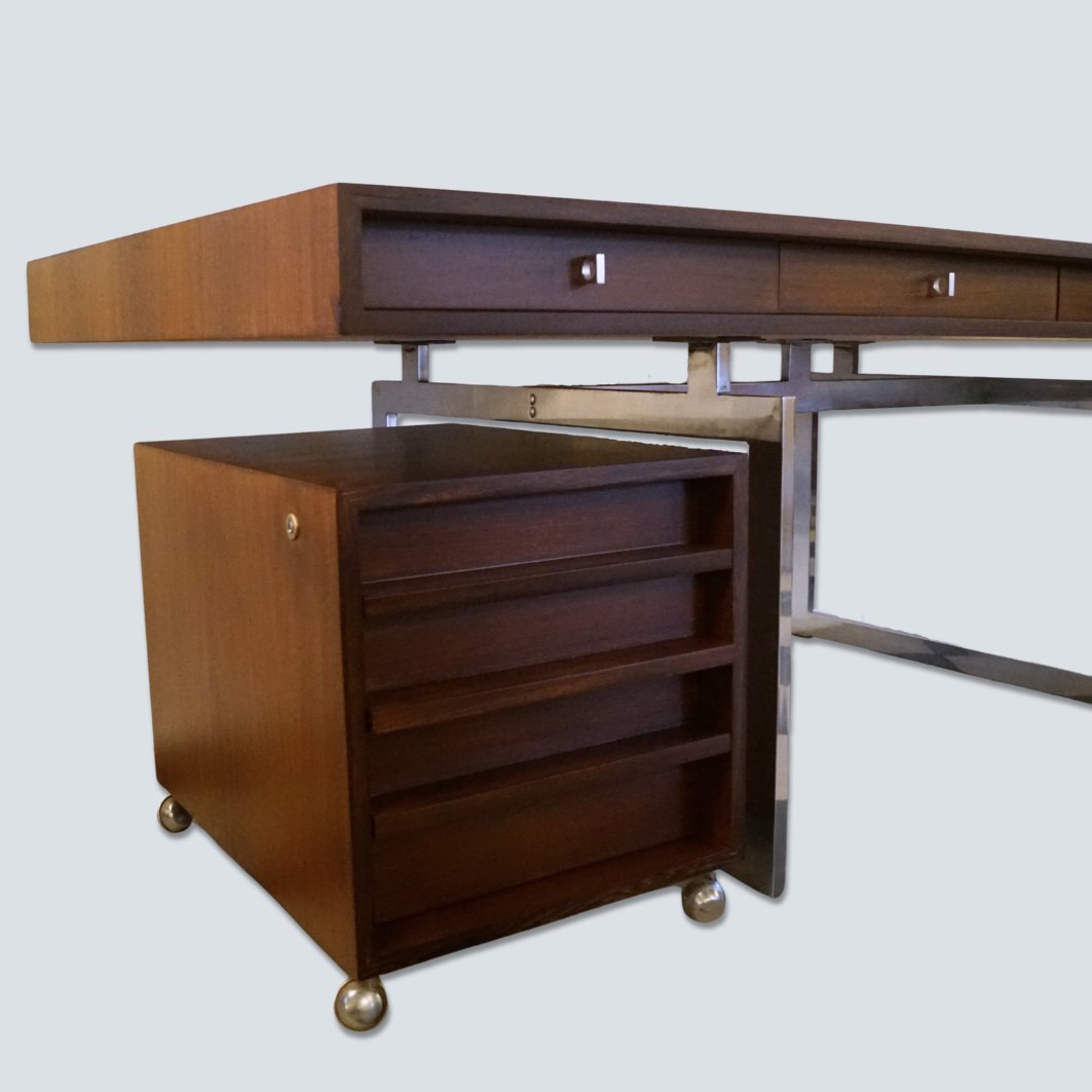 Bodil Kjær freestanding office desk in Wengé wood and chromed steel legs. Four lockable drawers. Drawer module on wheels included. Designed by Bodil Kjær in 1959. Iconic design, also called "The most beautiful desk in the world" and seen in the James Bond movies.Height: 73cm, Width: 100cm, Length: 200cm.