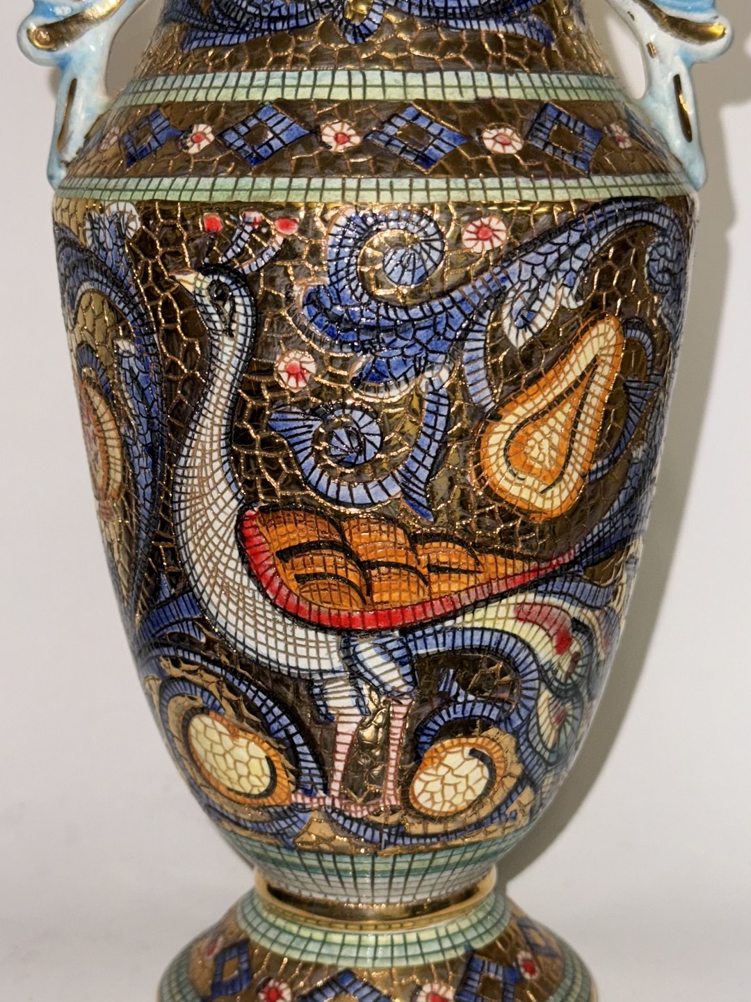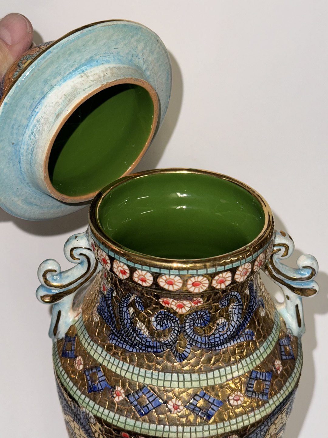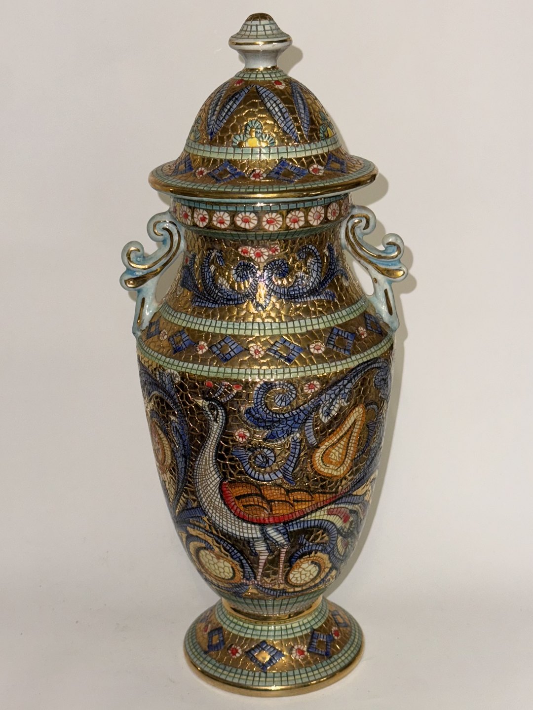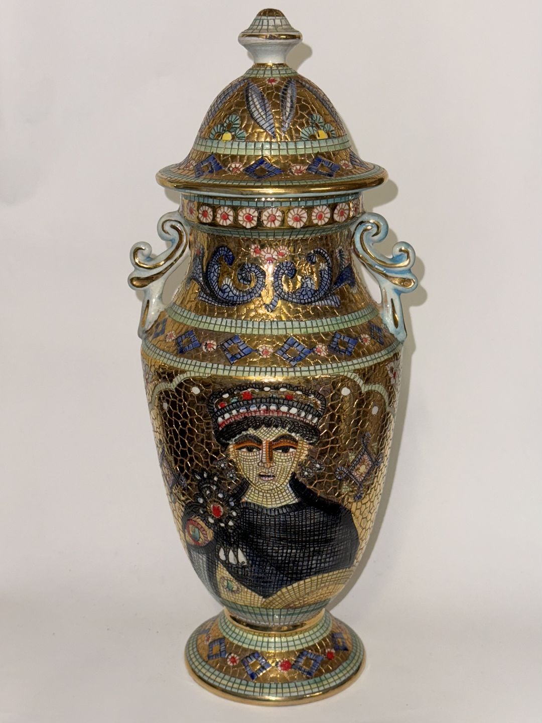 Deruta mosaic jar with handle and lid in majolica made in Umbria, Italy. Motif depicting Empress Theodora, Emperor Justinian's Byzantine wife from the sixth century, later canonized by the Eastern Orthodox Church as Saint Theodora. The mosaic design is engraved by hand, directly on the vase, instead of small attached pieces. On the back a motif With a colourful peacock. The item has a very colorful expression with a metallic surface. Appears in good condition. Factory mark on the bottom. H. 33.5 cm including lid. Dealer