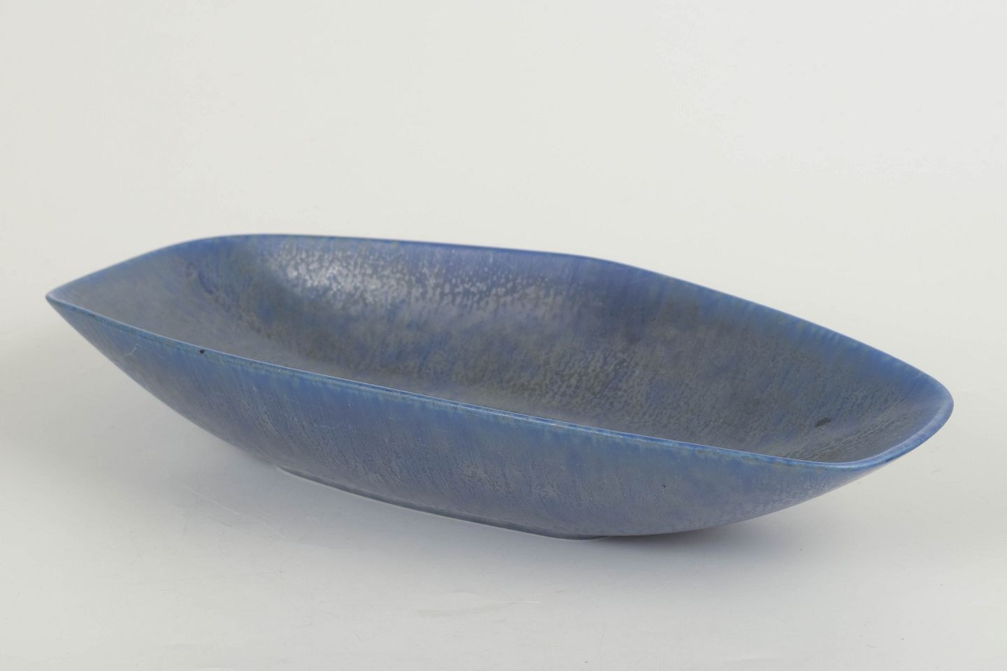 Elegant low stoneware bowl with a boat-shaped profile and matte blue glaze with softly variegated surface texture.