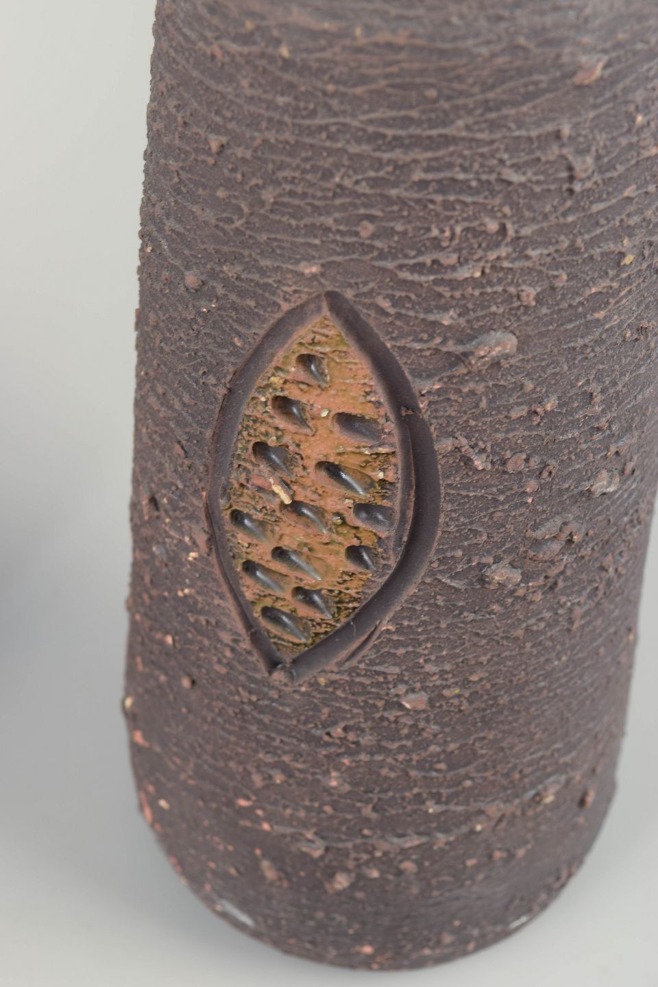 Two handmade bottle-shaped vases in chamotte clay with relief decoration and inlaid fields of coloured glaze in turquoise, green and brownish tones. Typical of Tilgmans’ rustic style with strong texture and geometric ornamentation.
