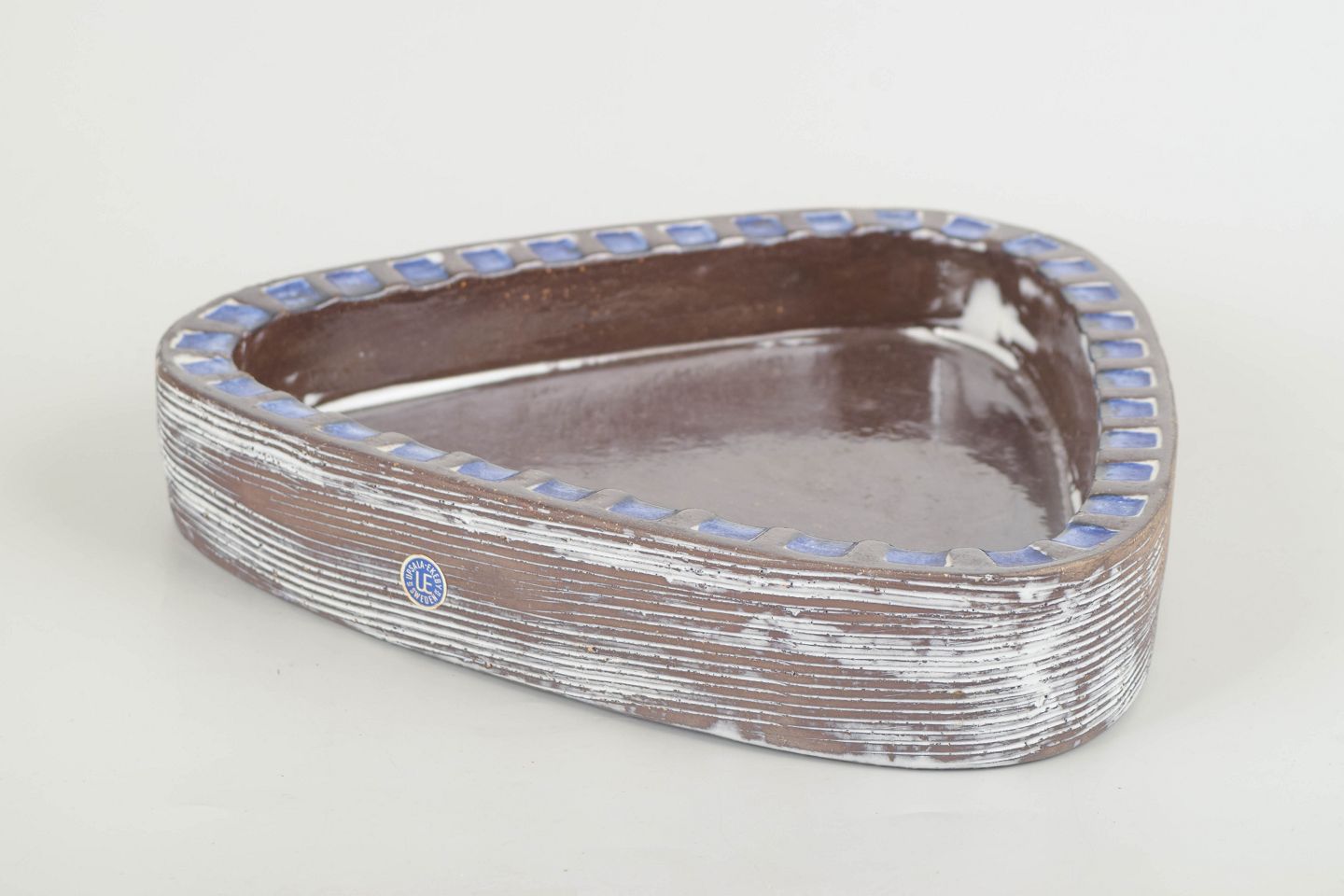 Low triangular ceramic dish with a brown base, white-washed structure and blue decorative rim – a fine example of Simmulson’s organic forms and subtle mid-century palette.