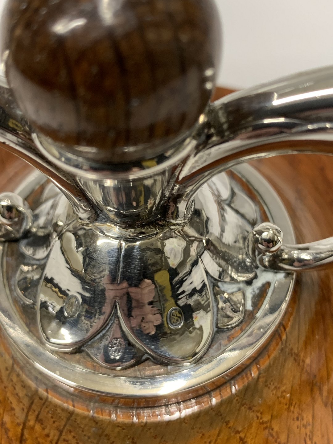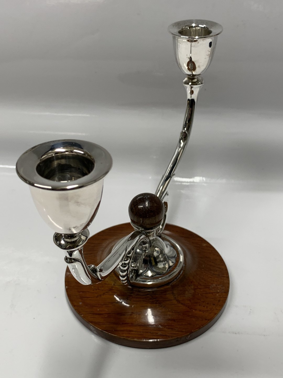 2 arm silver candlestick art decoStamped three towers.