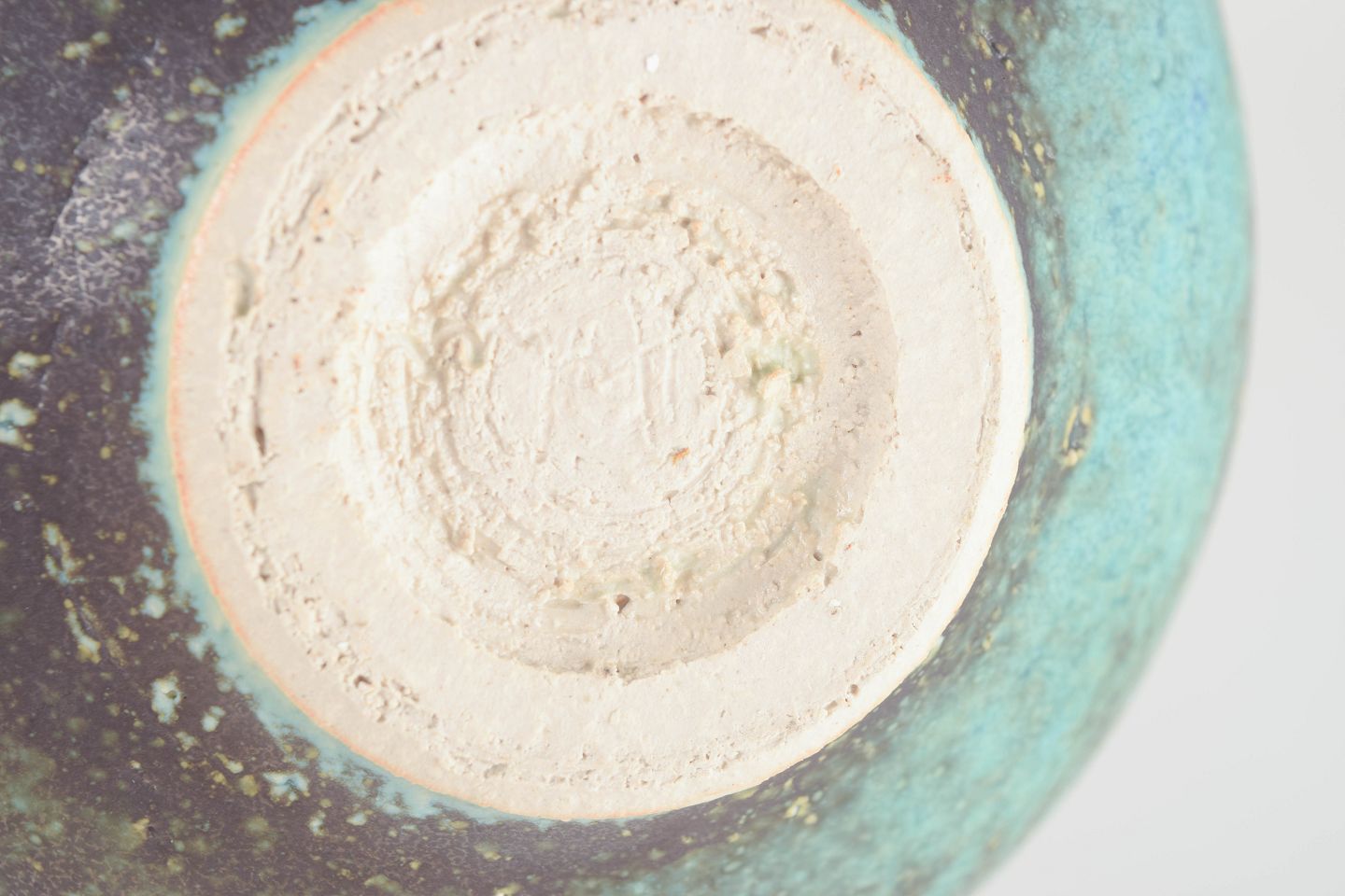 Scandinavian studio pottery of the 1970s often combines rustic forms with experimental glazes inspired by natural materials and earthy tones. The personal signature reflects the maker’s individual artistic approach and craftsmanship.