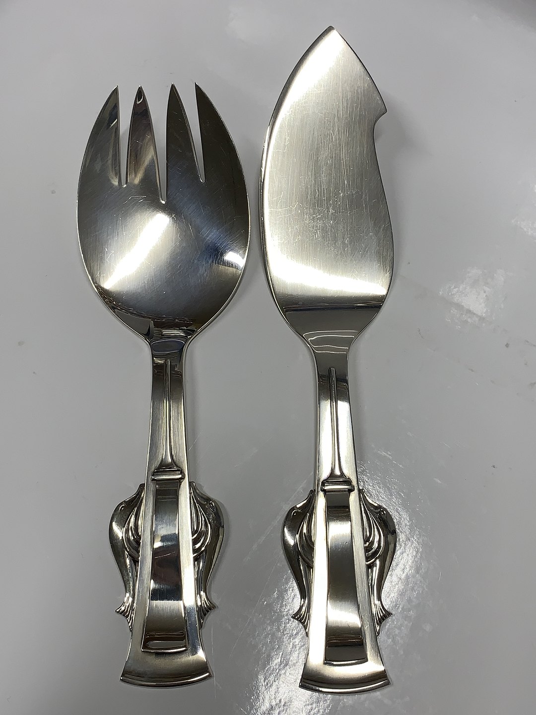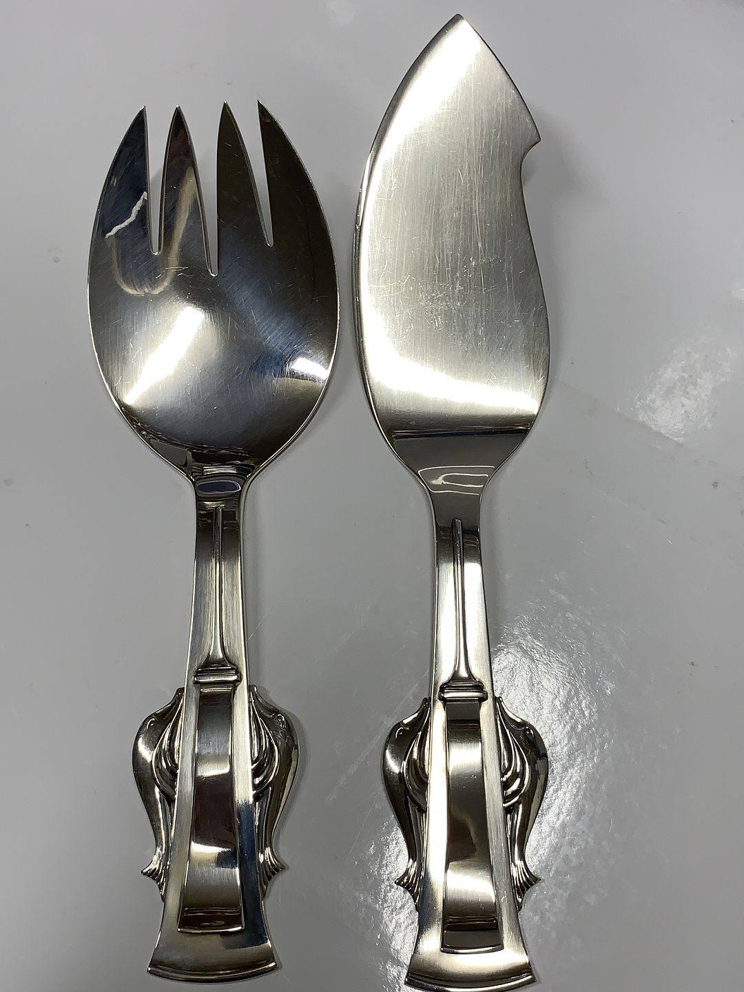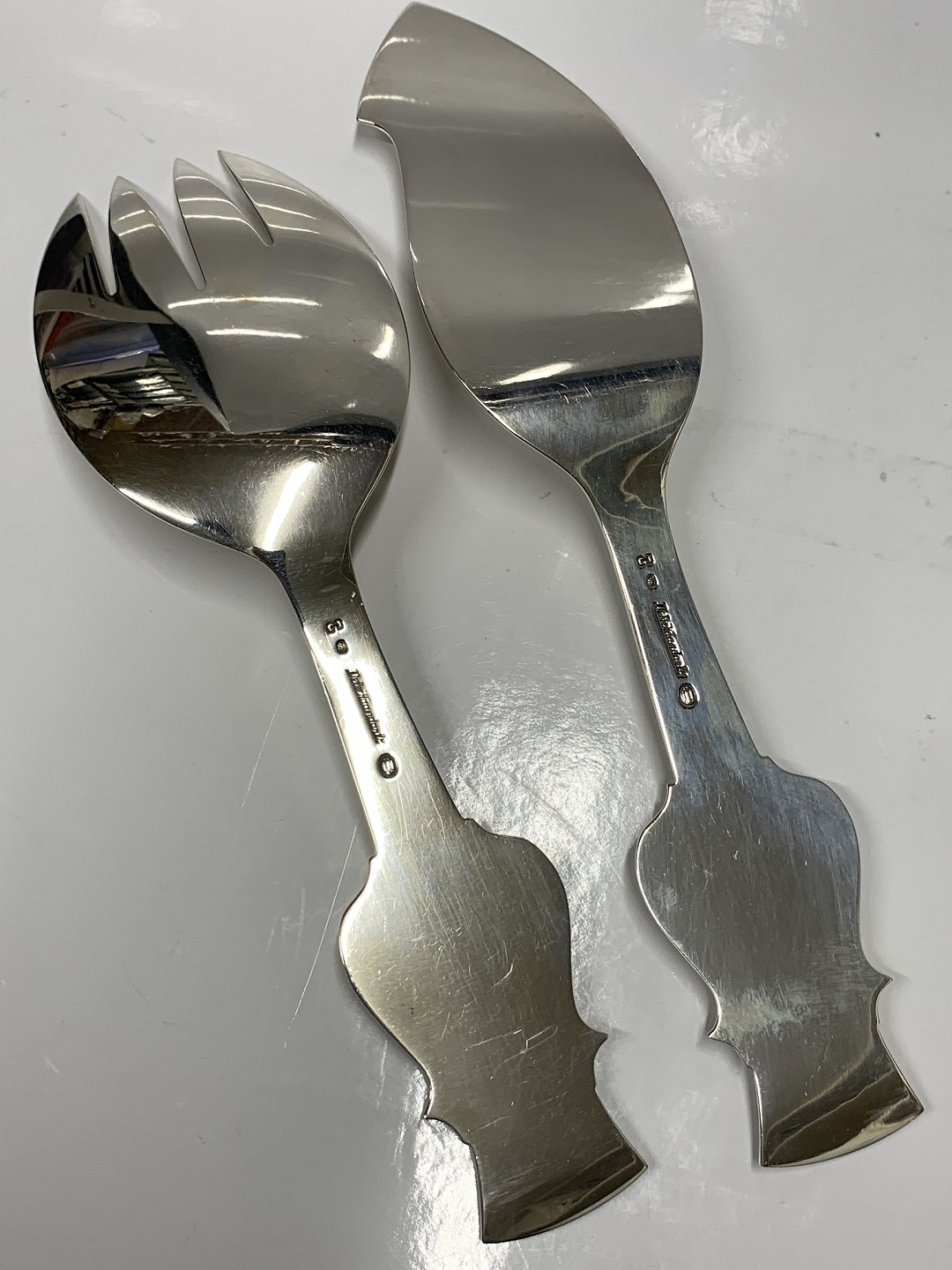 Fish serving set with Dolphins in silver Carl M. CohrLength 22.5 and 25.5 cm