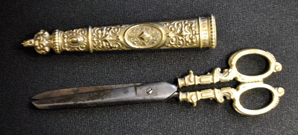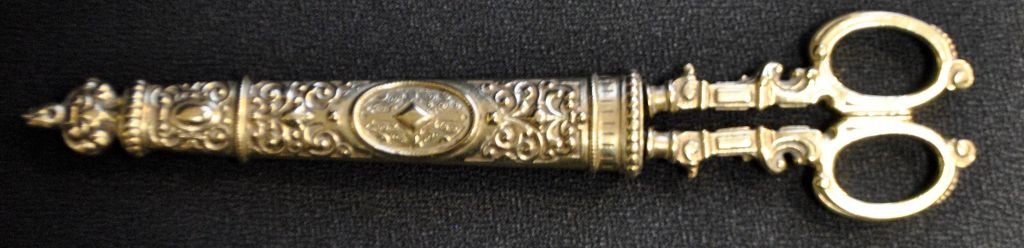 Brass scissors in decorated brass sheath, 1880. L. 26.5 cm.Item number: 28571