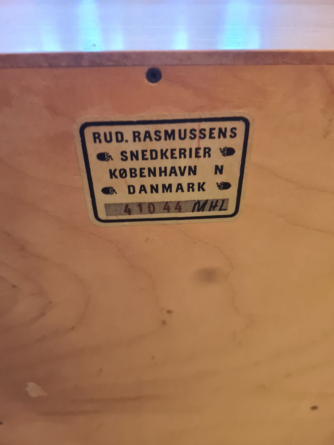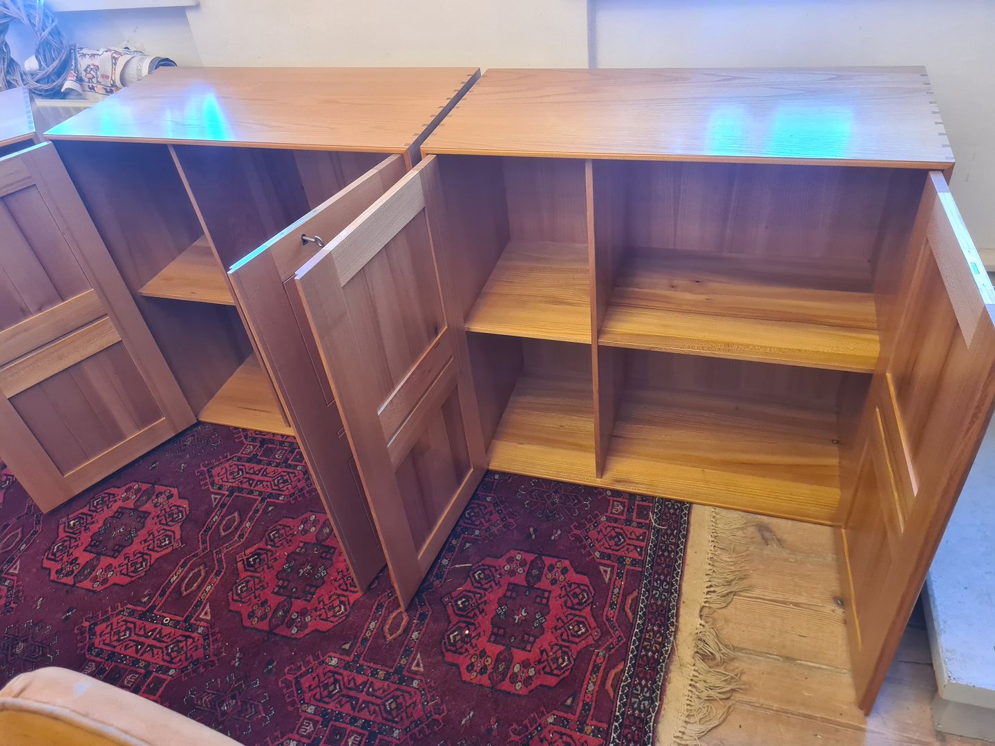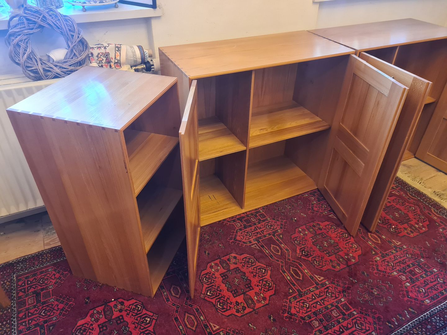 Mogens Koch skabe samt en halv reol udført i massiv Elm for Rud. Rasmussen. Fremstillet Ca. 1970’erne.Fremstår i pæn brugt stand, det ene skab har en fugtring på toppen. (Se foto)