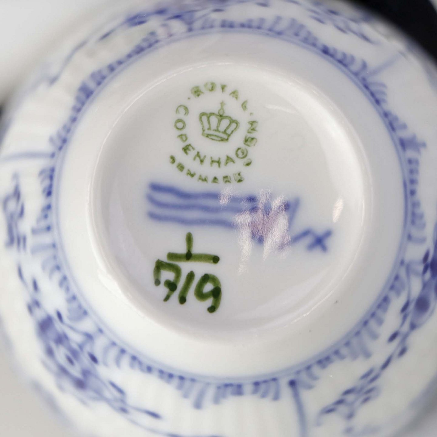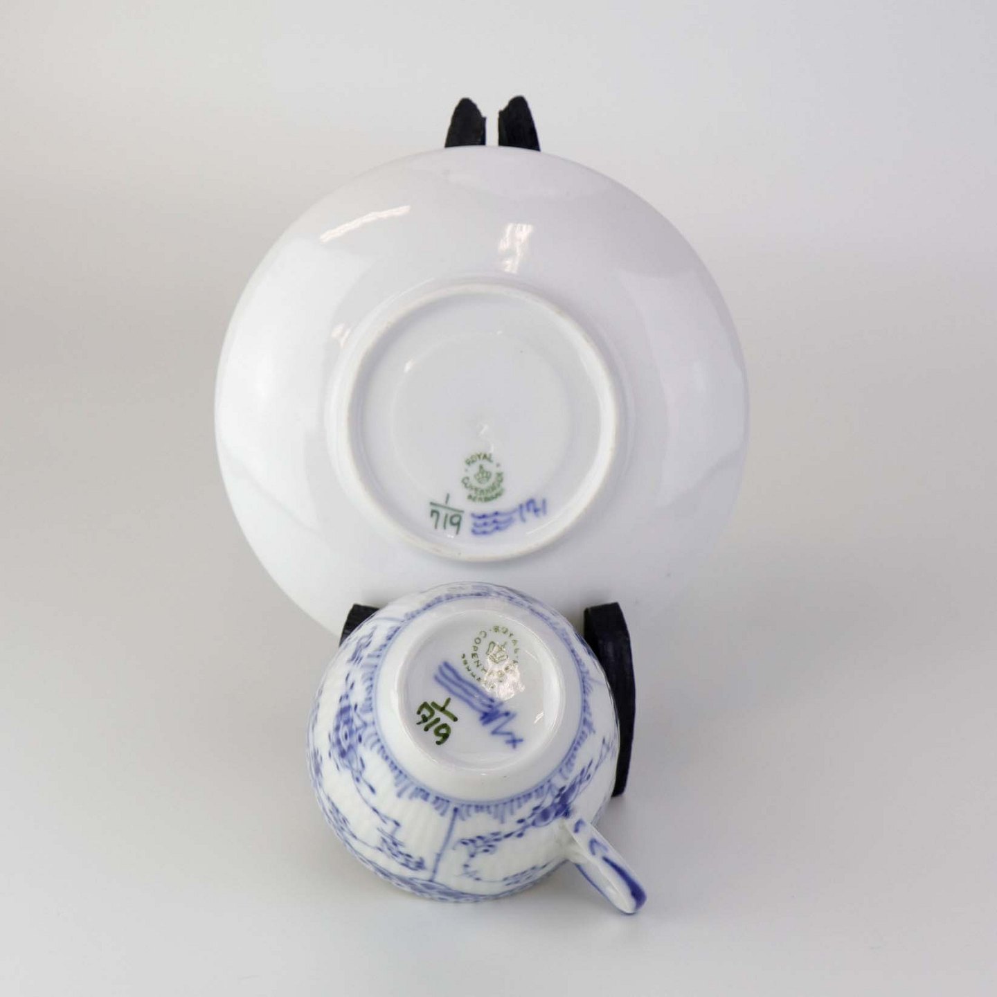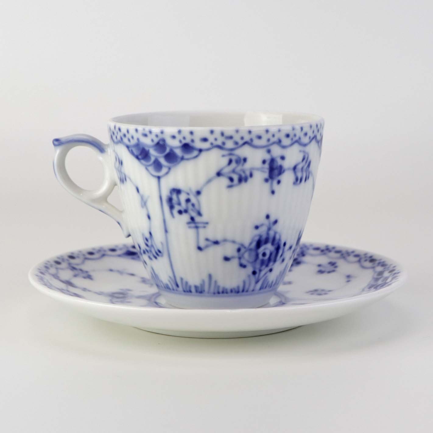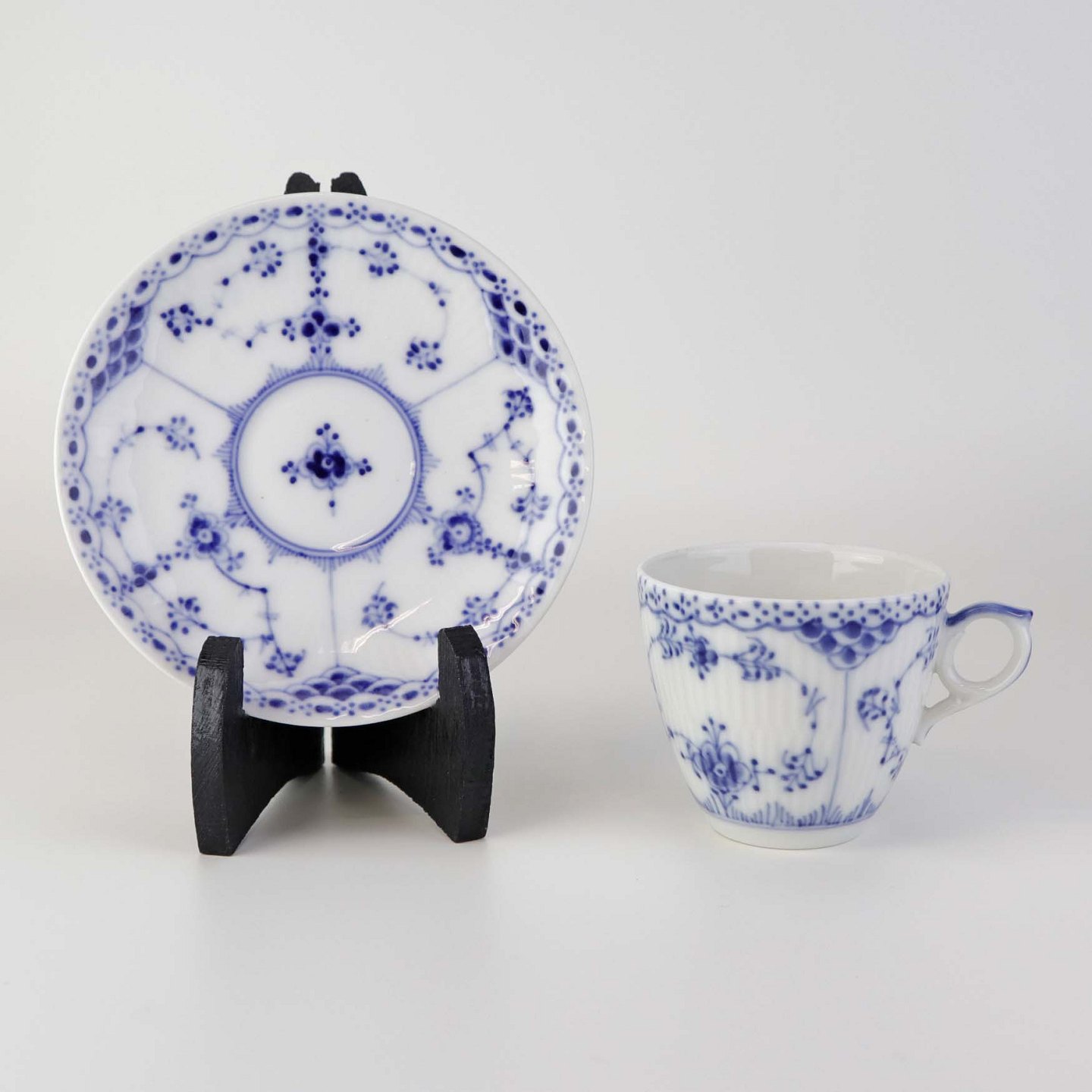 Mellemstor kaffekop med underkop i kongeligt porcelæn fra stellet Musselmalet Halvblonde. Nr. 1/719Design Arnold Krog