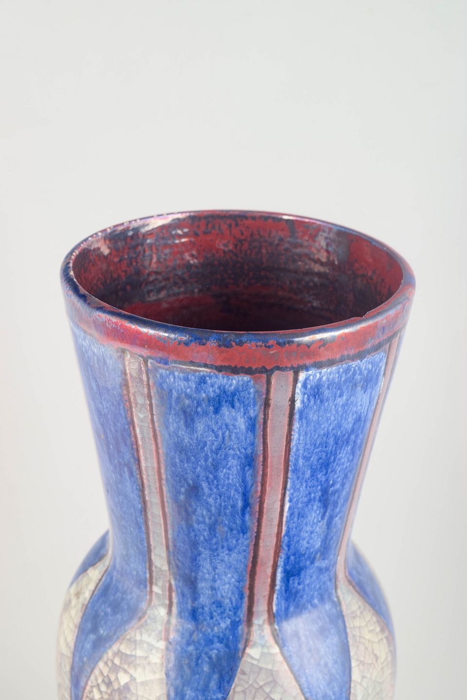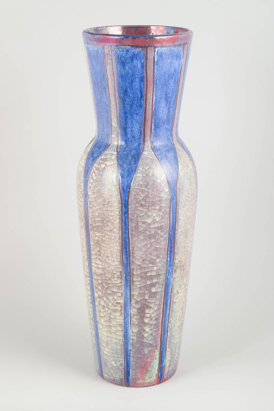 Impressive tall ceramic vase with a strong iridescent glaze in blue, silver and red tones. The faceted, geometric architecture is typical of Starck’s celebrated work for Michael Andersen on the island of Bornholm.