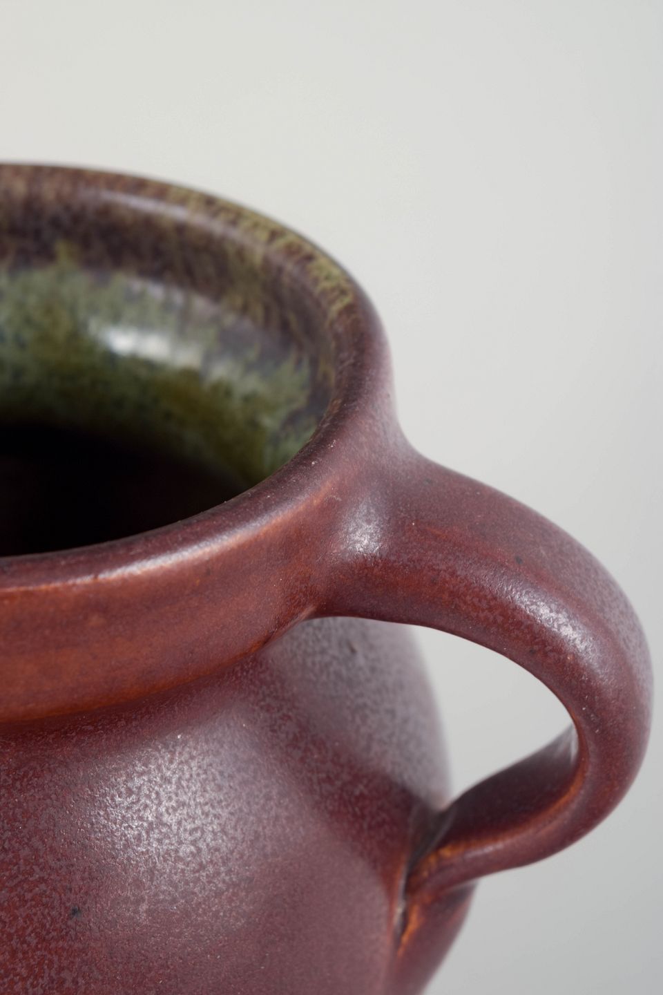 Hand-thrown stoneware vase in a deep reddish-violet glaze with subtle variation and a contrasting multicoloured interior glaze. Softly rounded body with elegant double handles.