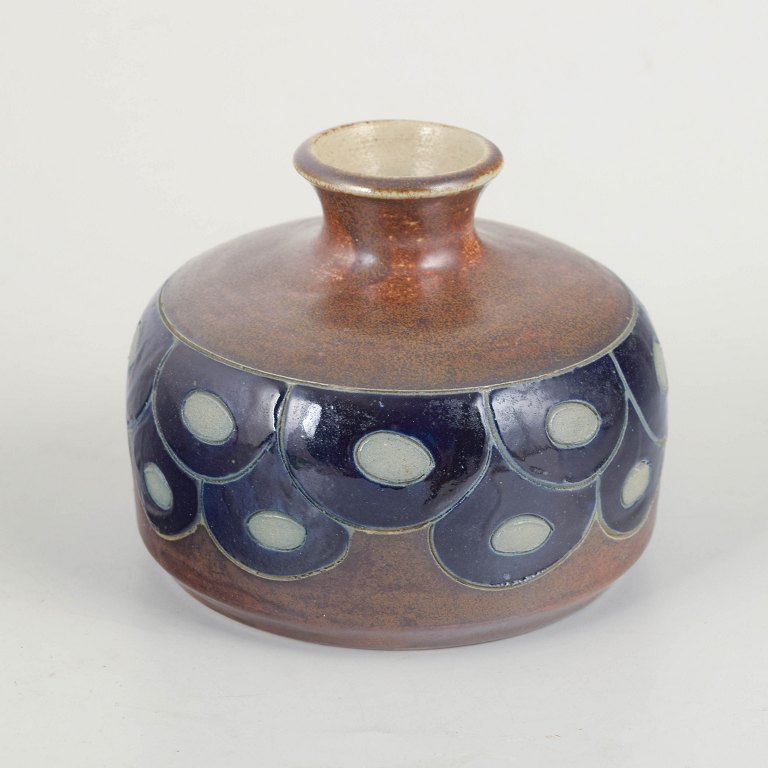 Goebel, Tyskland, Vase, 1970/80’erneUnika håndlavet stentøjsvase i afrundet form med kort hals og dekorativ bånddekoration i dybblå og lyse felter.