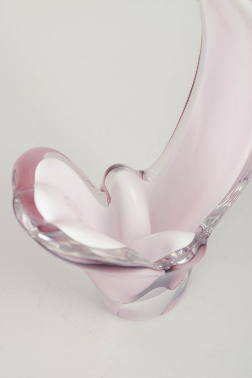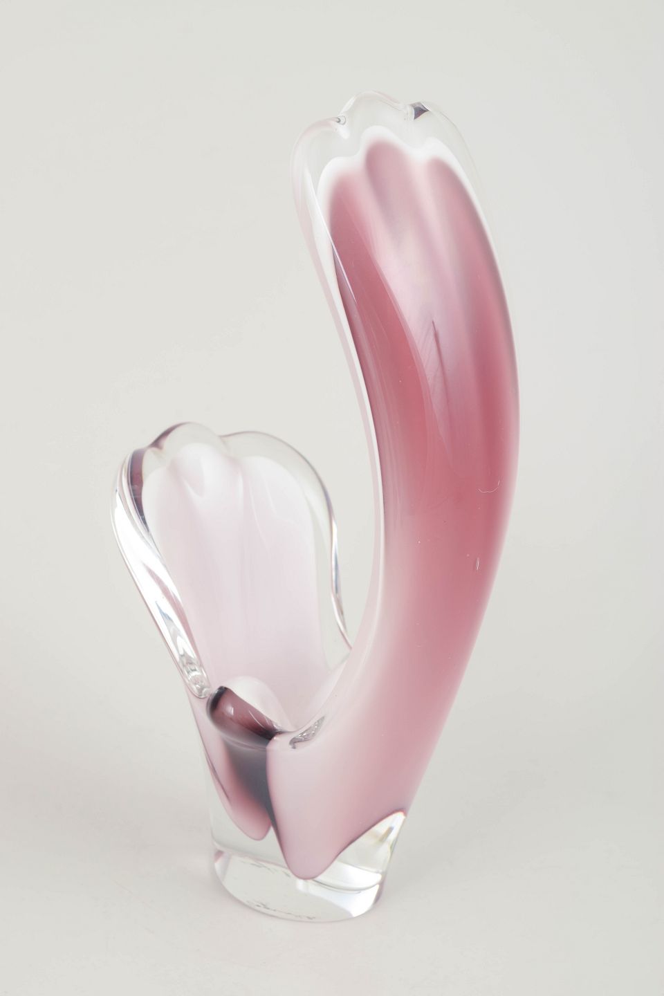 Elegant “Coquille” form in layered art glass with pink to light violet colouration, a white intermediate layer, and clear outer casing. The tall, sweeping, leaf-like silhouette is typical of Kedelv’s most organic and sculptural designs.