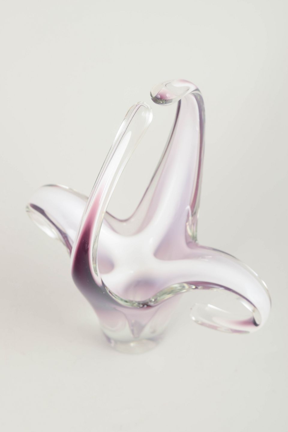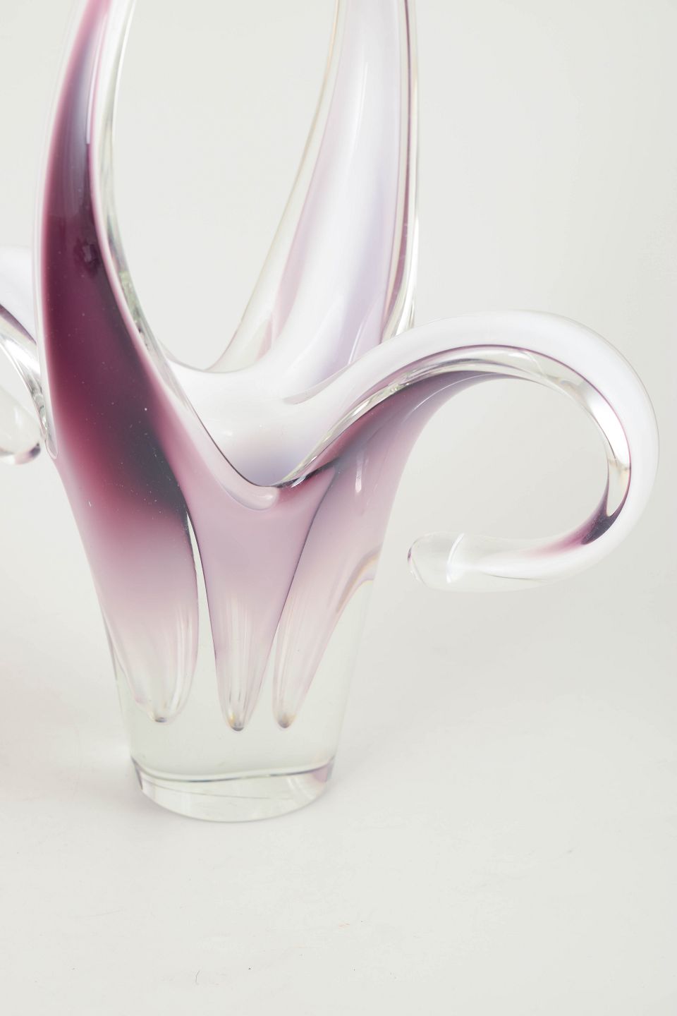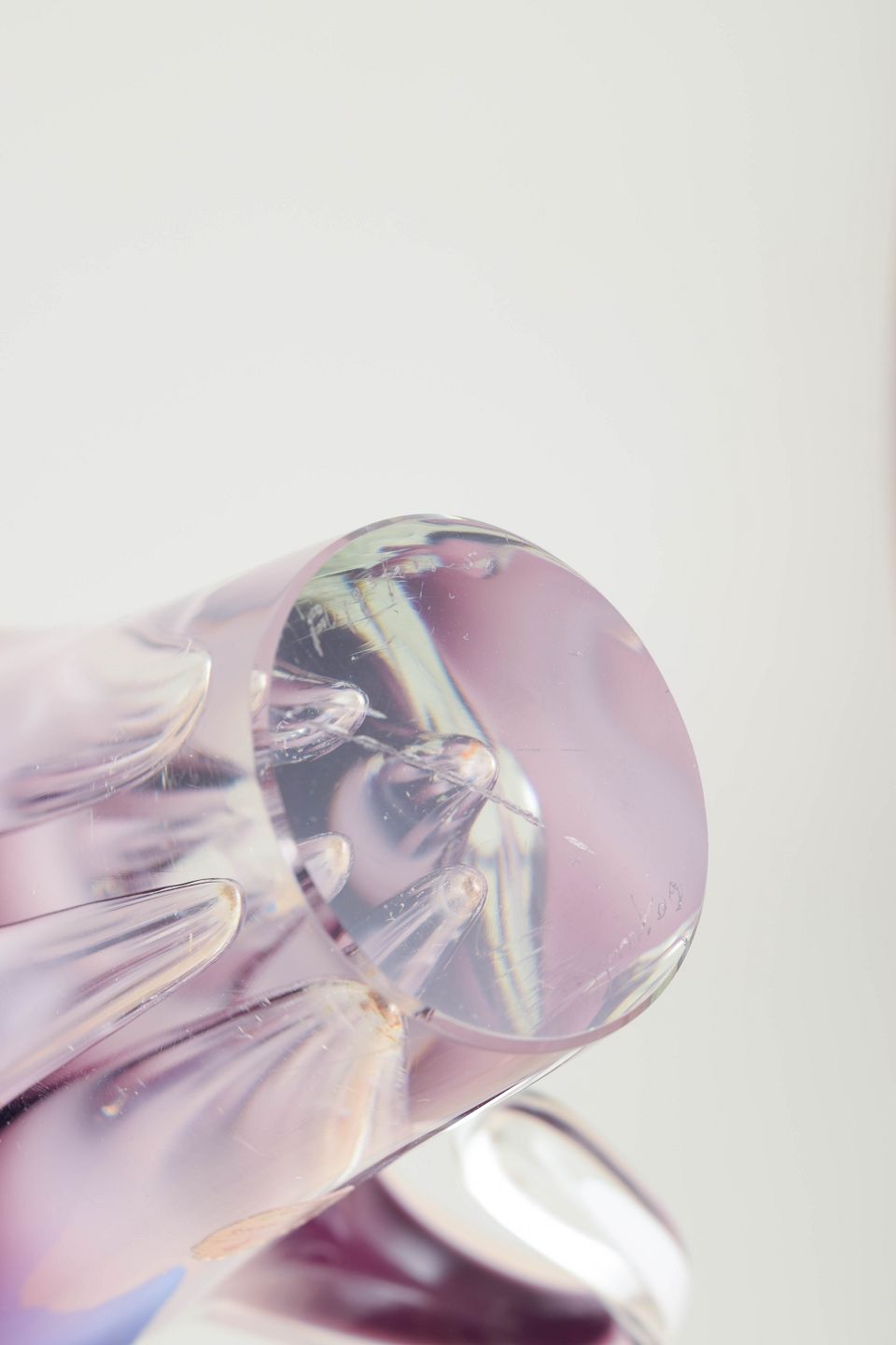 Large and dramatic “Coquille” form in layered art glass with light pink to violet colour gradation, a white intermediate layer, and clear outer casing. The upward-flowing, curling arms create an elegant, flower-like sculptural presence—one of Kedelv’s most characteristic shapes.