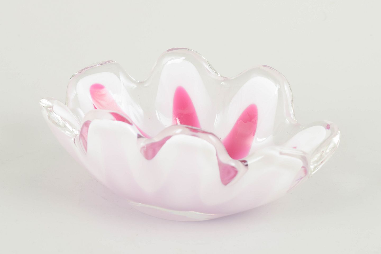 Decorative “Coquille” bowl in layered art glass with pink interior colouration, a white middle layer, and clear outer casing. The wavy, flower-like shape represents one of Kedelv’s more sculptural variations within the series.