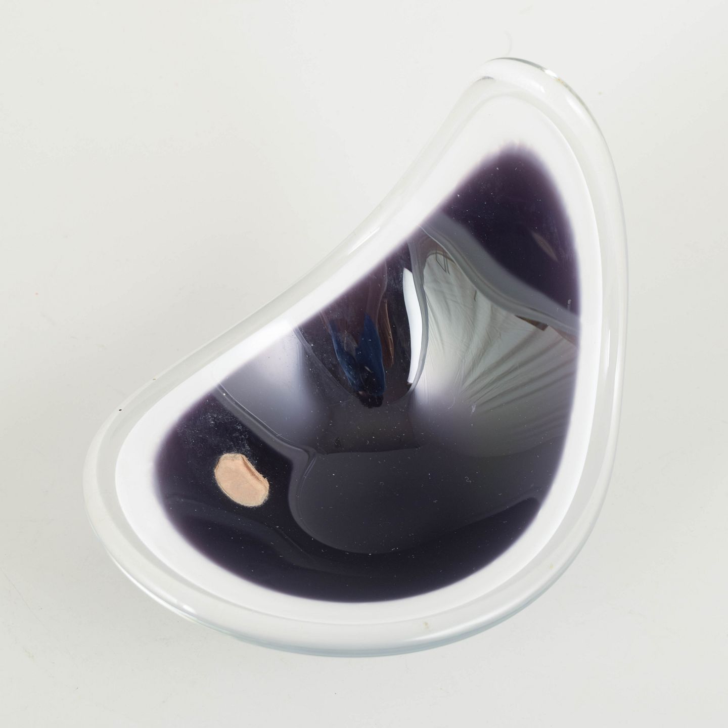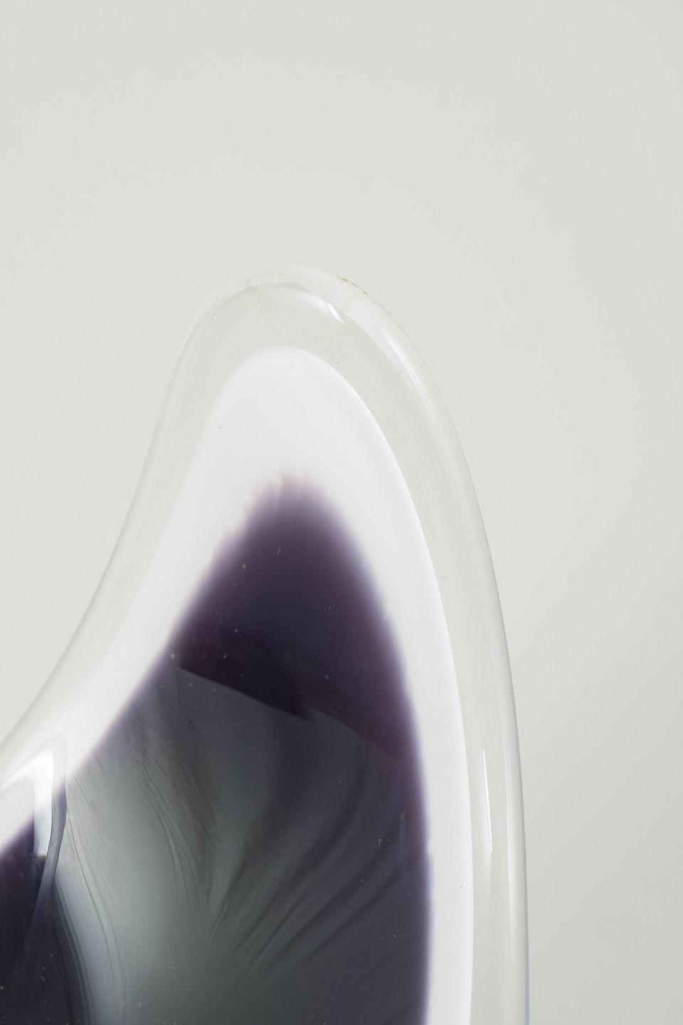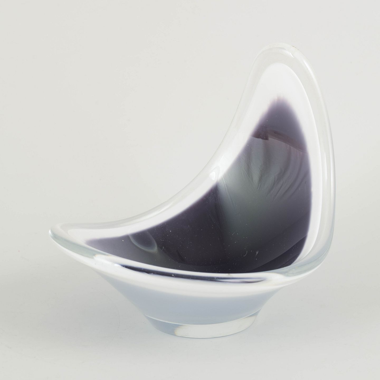 “Coquille” bowl in layered art glass with deep grey/black colouring and a white intermediate layer, encased in clear glass. The asymmetrical, upward-curving form is characteristic of Kedelv’s organic mid-century design language.